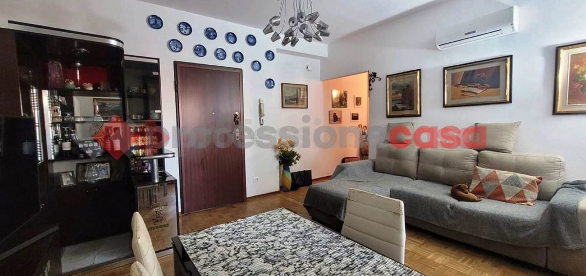 L'immobile attualmente predisposto alla suddivisione in due unit abitative cos composte: La prima soluzione misura circa 85 mq ed composta da: ingresso, soggiorno con angolo cottura e doppio accesso al balcone parzialmente verandato, due camere, una matrimoniale con accesso al balcone e una singola e il bagno senza finestra e con box doccia.