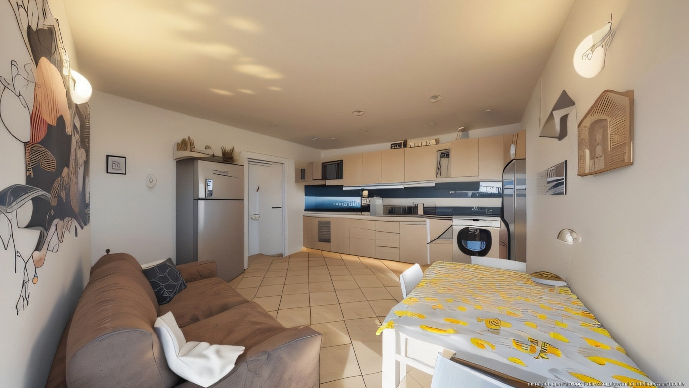 Gli spazi interni sono ben distribuiti: zona giorno open space con soggiorno e cucina, due camere da letto e due bagni.