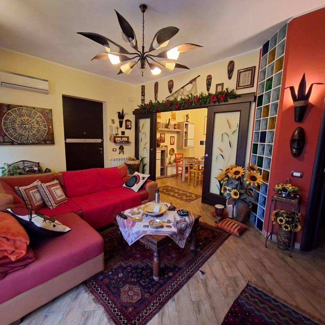 Gli ambienti si compongono di un accogliente soggiorno e una cucina abitabile separati da una porta a vetri, due camere da letto spaziose e un servizio.