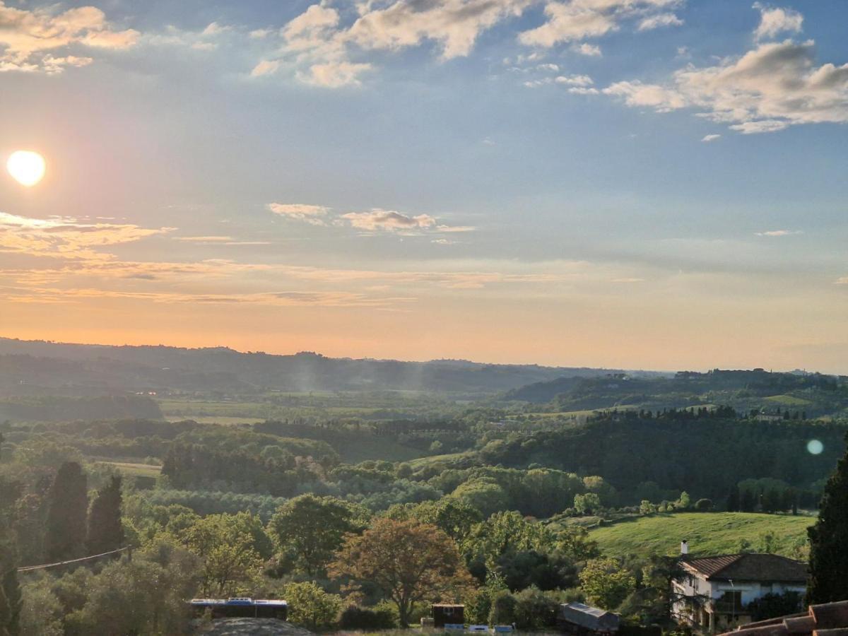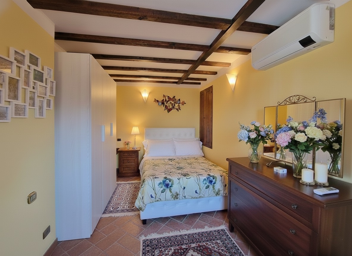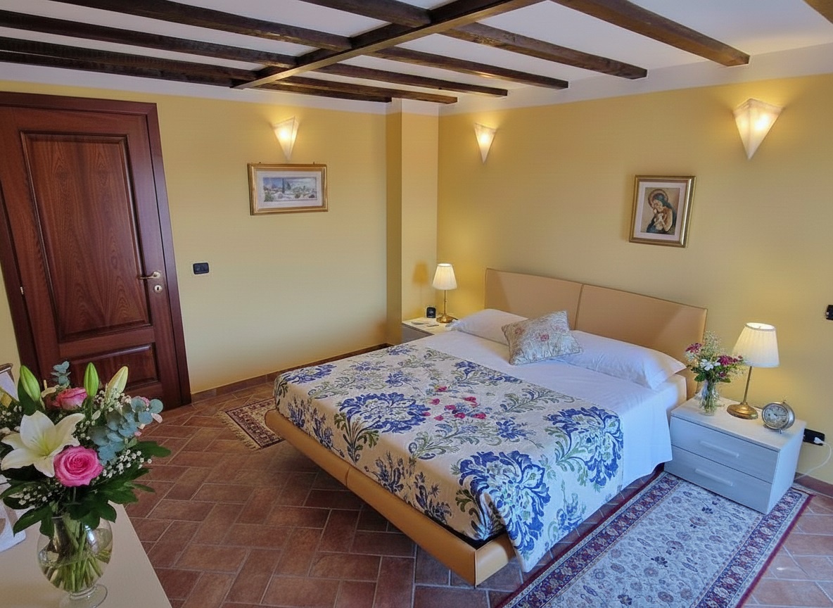 Camera principale con balcone con vista panoramica sulla campagna toscana.