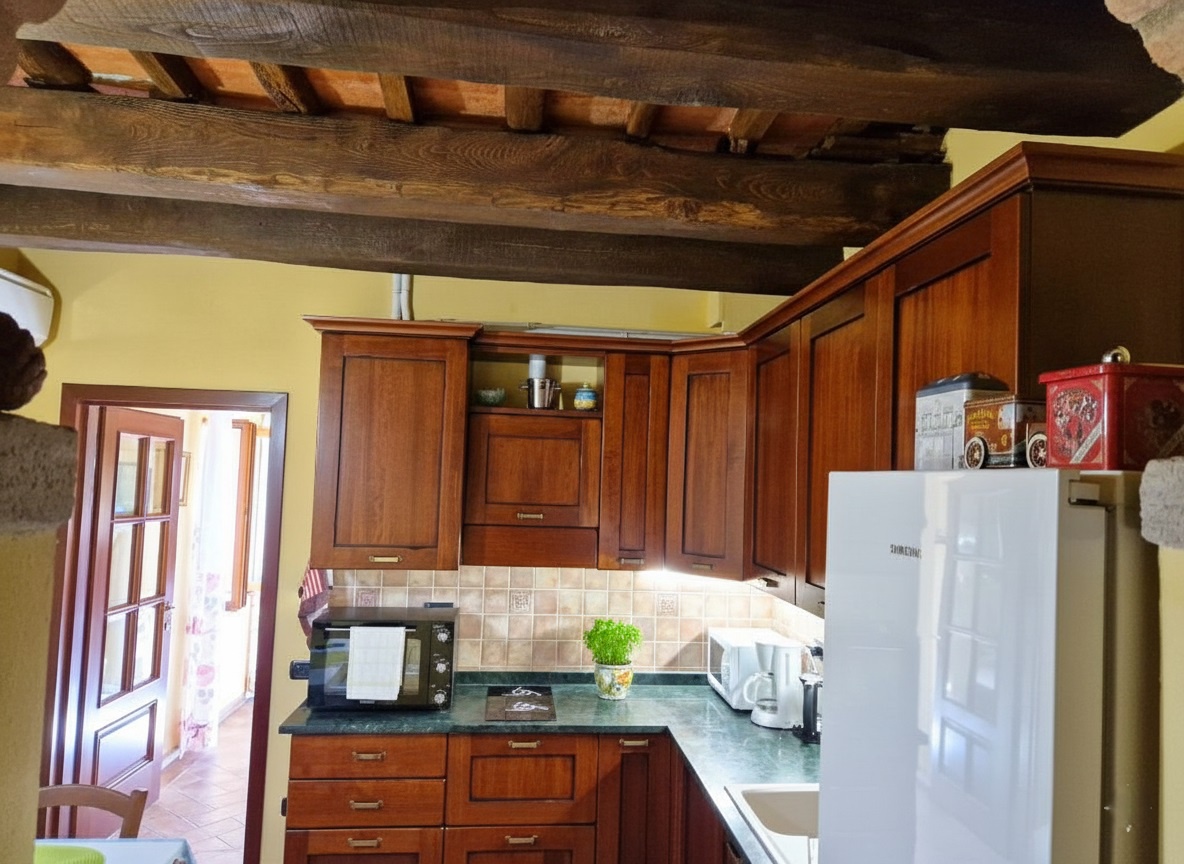 Peccioli Loc. Fabbrica - Splendido appartamento di circa 140 mq, completamente ristrutturato in stile rustico con travi e travicelli, soffitti a volte, composto da ampia zona giorno con cucina, soggiorno, salotto, bagno con sauna adiacente, piano superiore con due grandi camere e bagno.