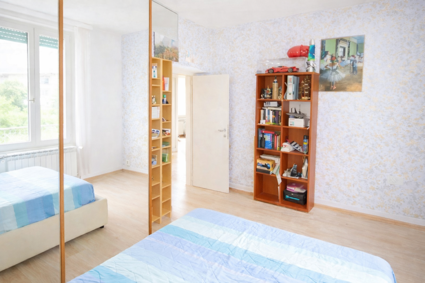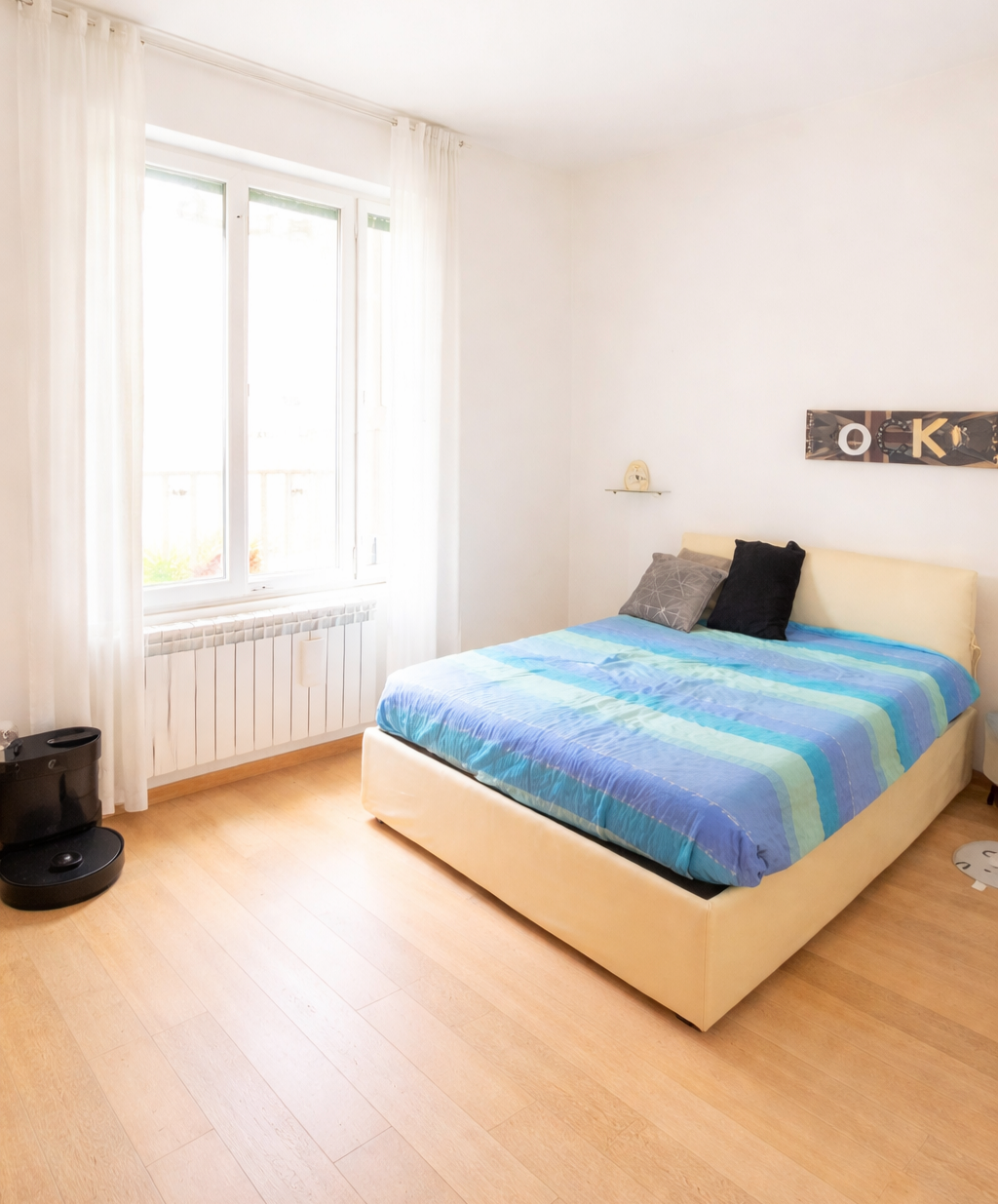 E' composto da: ingresso in doppio soggiorno con angolo cottura, disimpegno notte con camera matrimoniale, due camere singole, un bagno con finestra ed un ripostiglio (o 2° bagno). L'appartamento è stato ottimamente ristrutturato nella sua completezza e si presenta luminoso, pavimenti con parquet, infissi interni ed esterni nuovi, zanzariere ed aria condizionata.