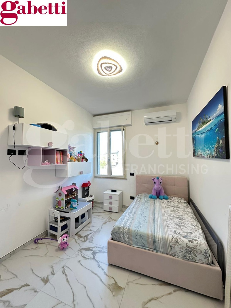Internamente composto da ingresso disimpegno, ampia zona giorno doppia con camino, angolo cottura e balcone panoramico con vista sulla citt di circa 7 mq, due camere matrimoniali delle quali una con bagno privato, cameretta/ studio e bagno finestrato.