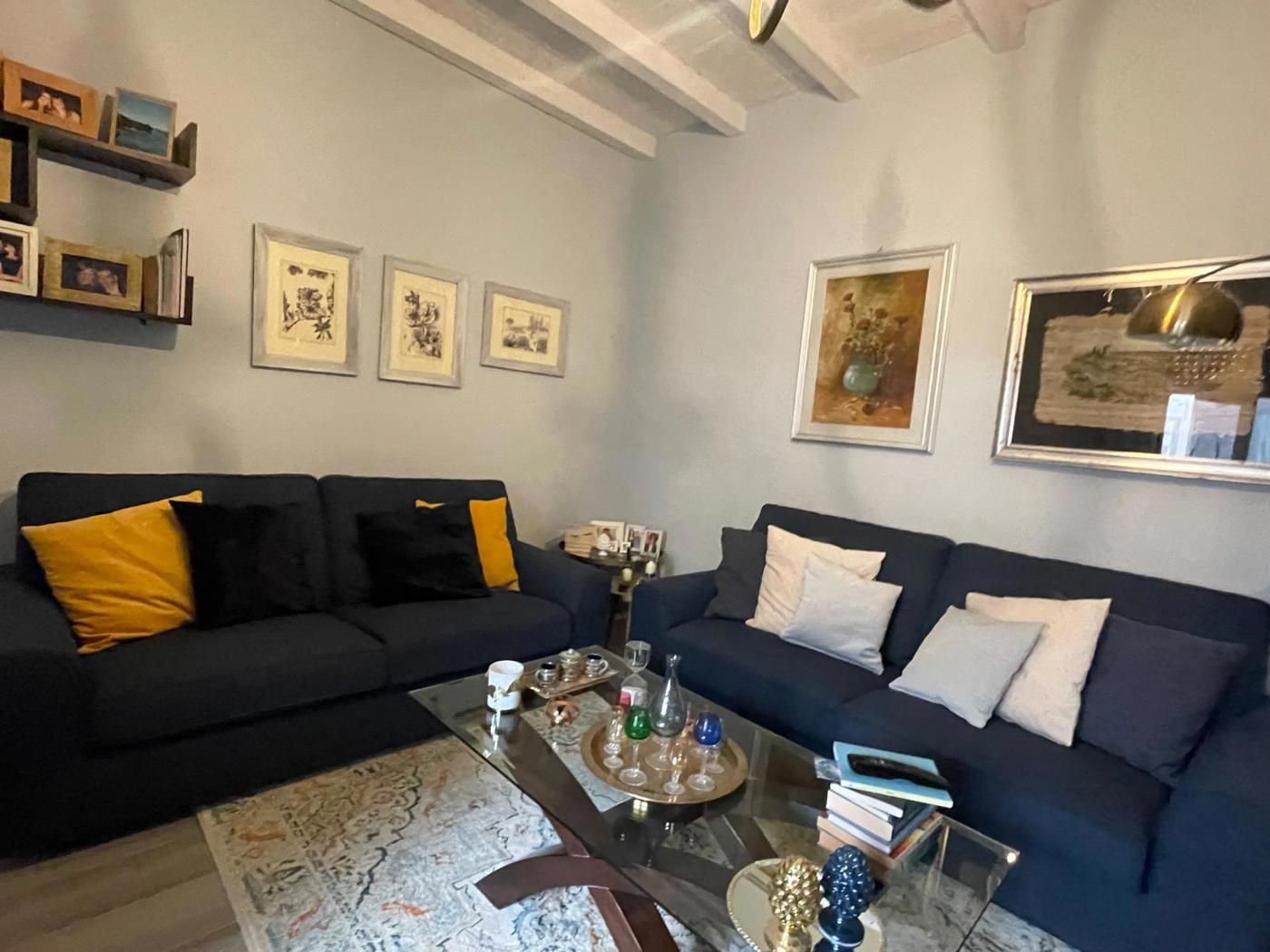 Le finiture di pregio includono pavimenti in ceramica simil parquet e soffitti con travi in legno, creando un'atmosfera calda e accogliente.