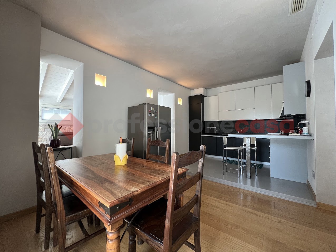 La cucina a vista, moderna e funzionale, si integra perfettamente con la zona giorno, creando un ambiente conviviale e contemporaneo.