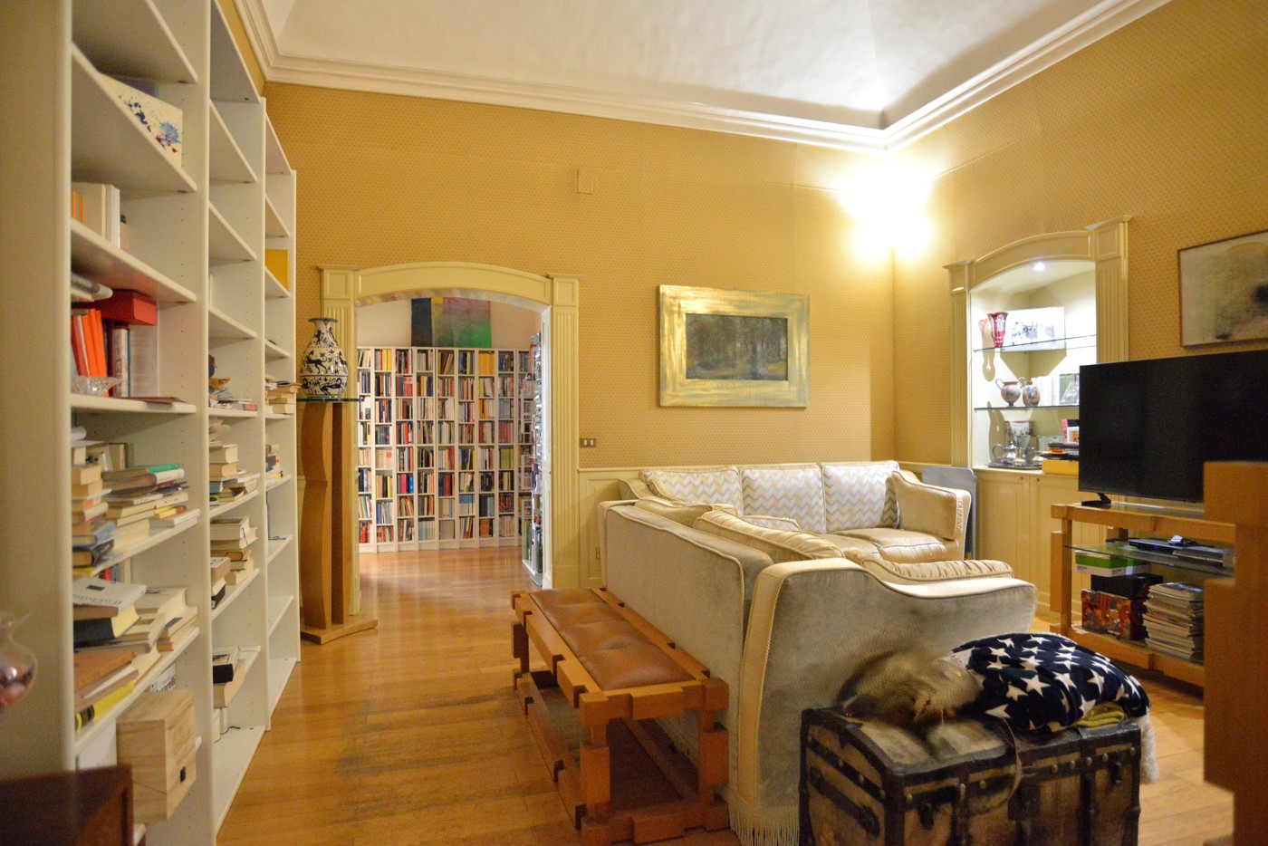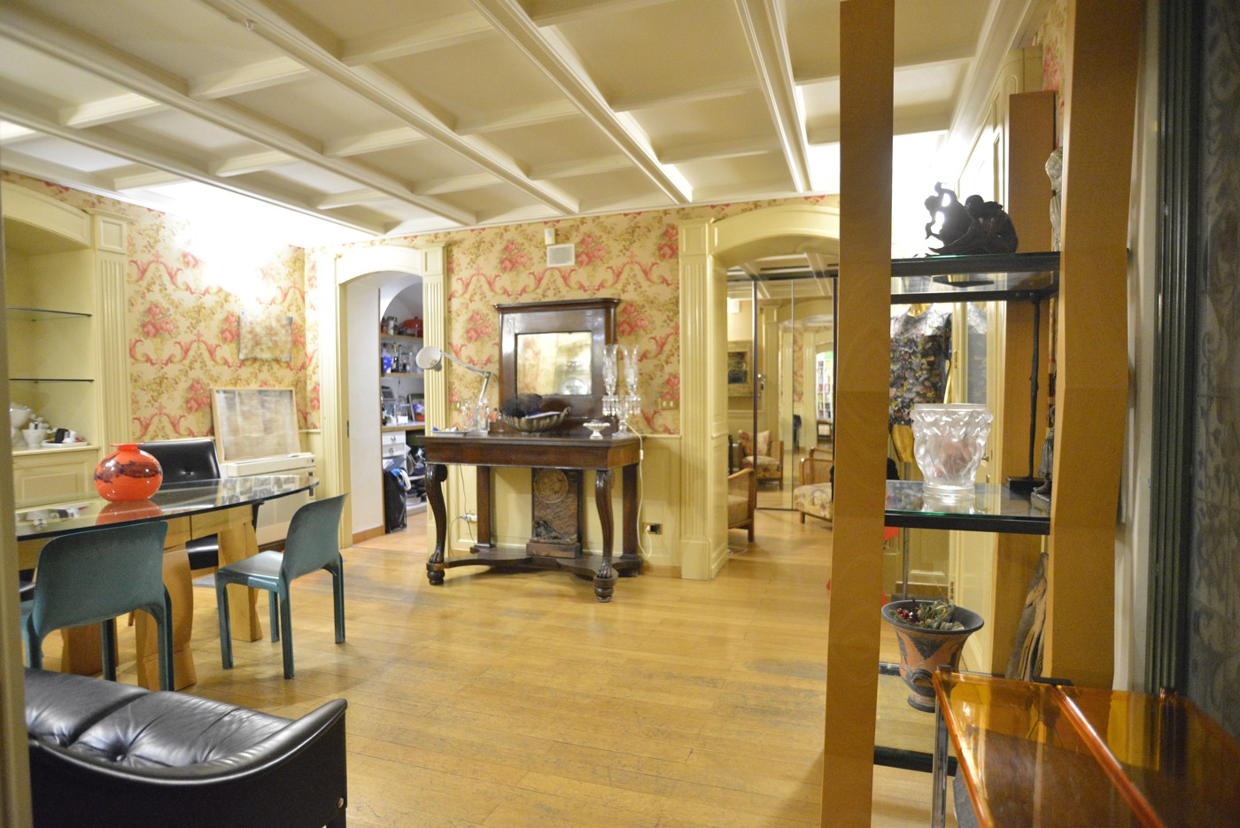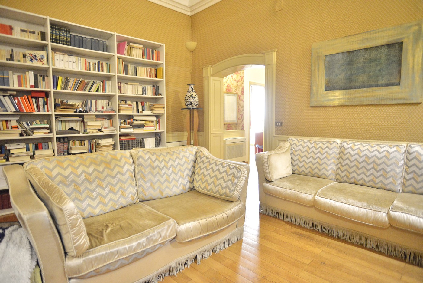 Il pavimento in parquet fa da filo conduttore di tutta la casa. Il salotto un ambiente elegante, con le volte alte fino mt. 5,50 ca. valorizzate dalle cornici e dal gioco di colori, con una grande finestra affacciata sul vano scale.