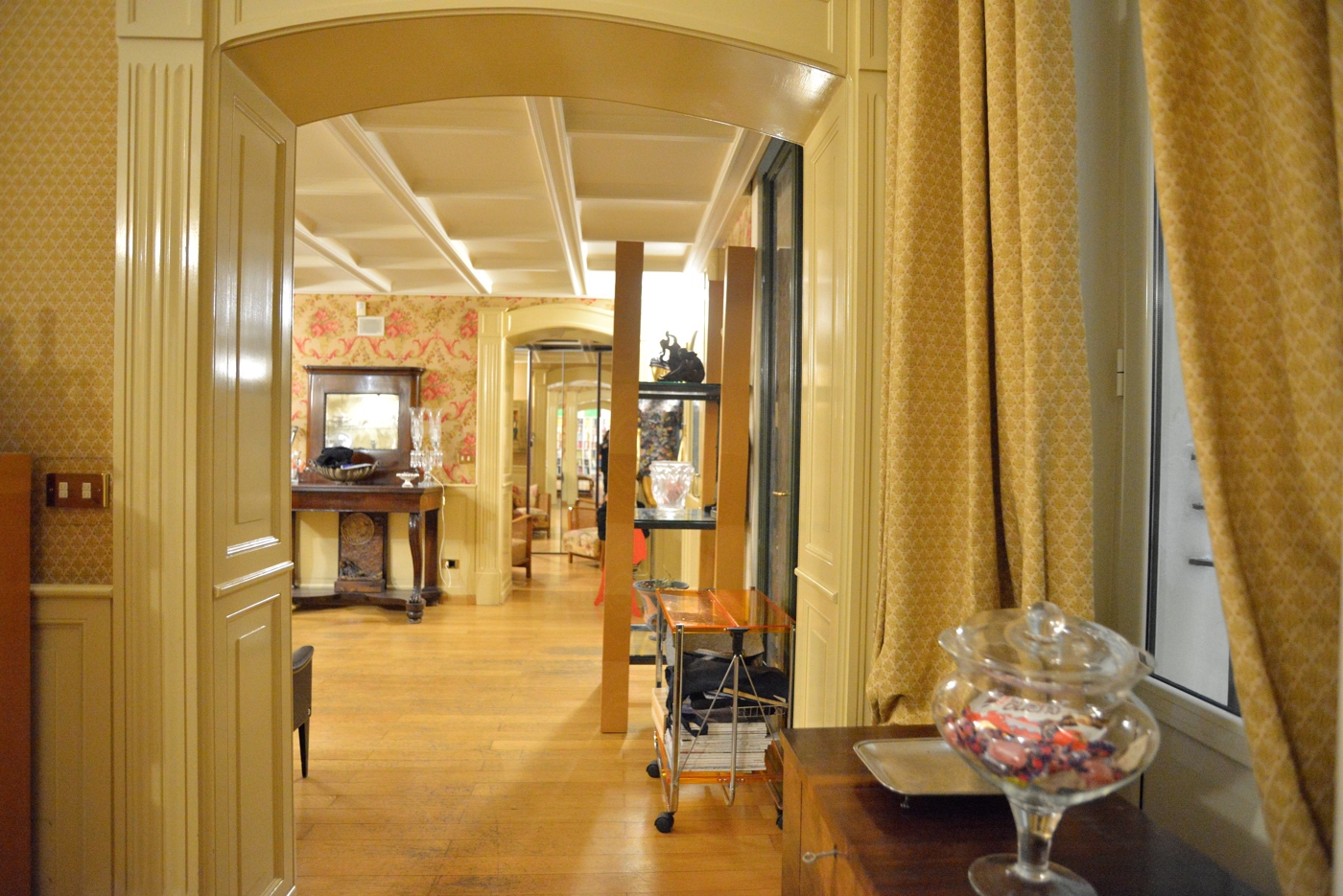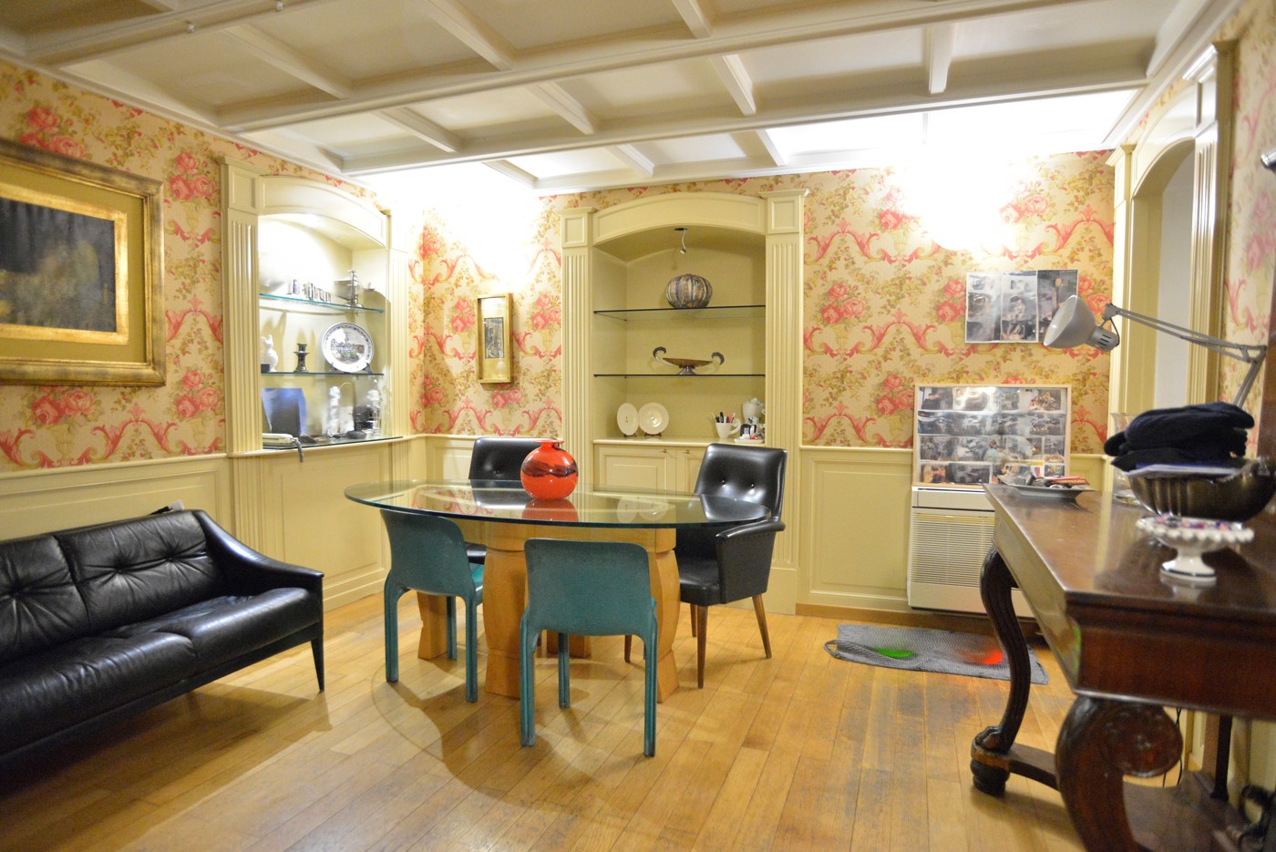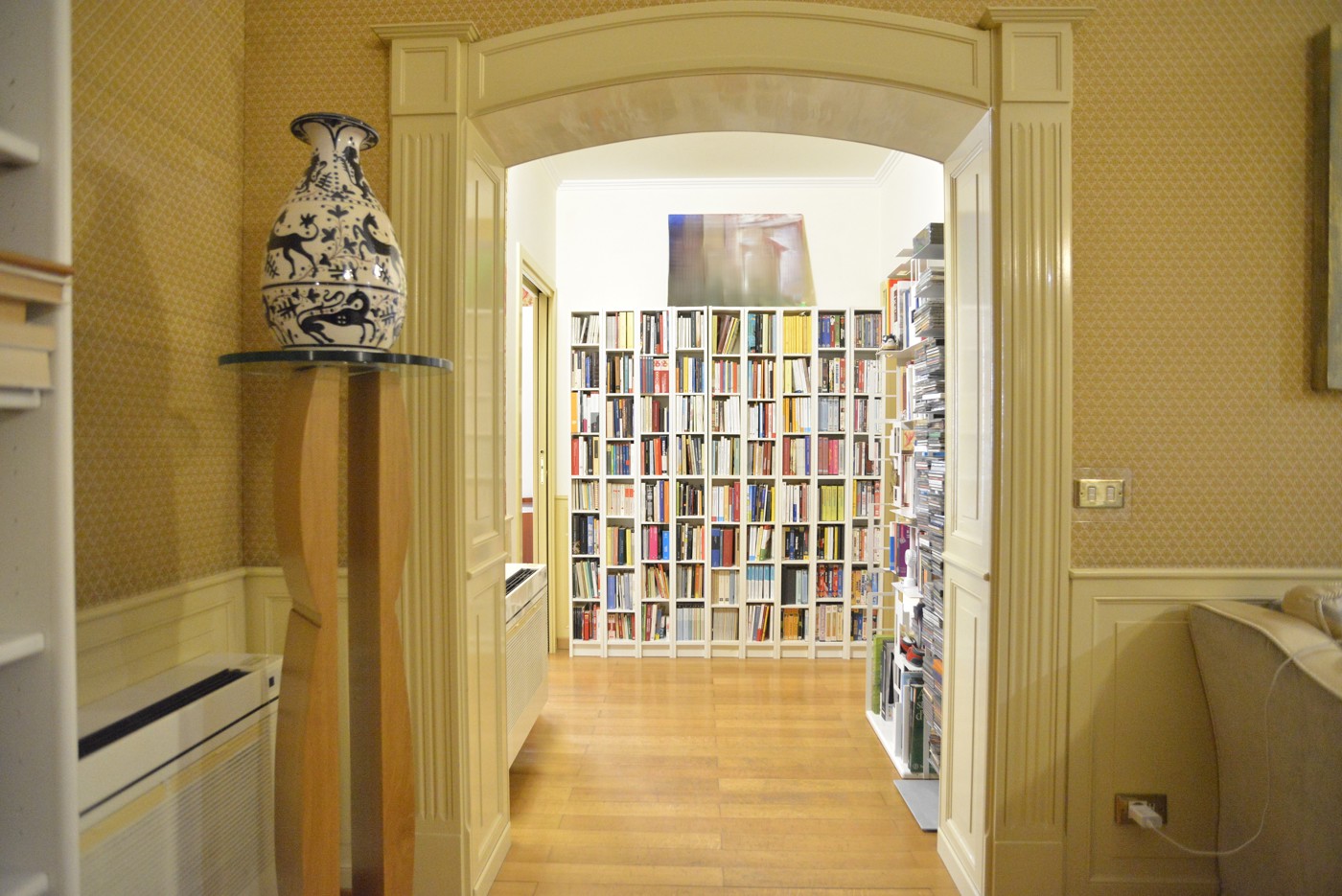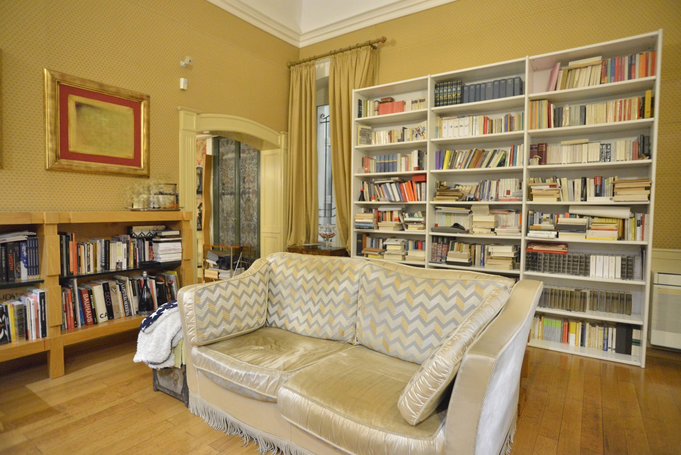 Il pavimento in parquet fa da filo conduttore di tutta la casa. Il salotto un ambiente elegante, con le volte alte fino mt. 5,50 ca. valorizzate dalle cornici e dal gioco di colori, con una grande finestra affacciata sul vano scale.
