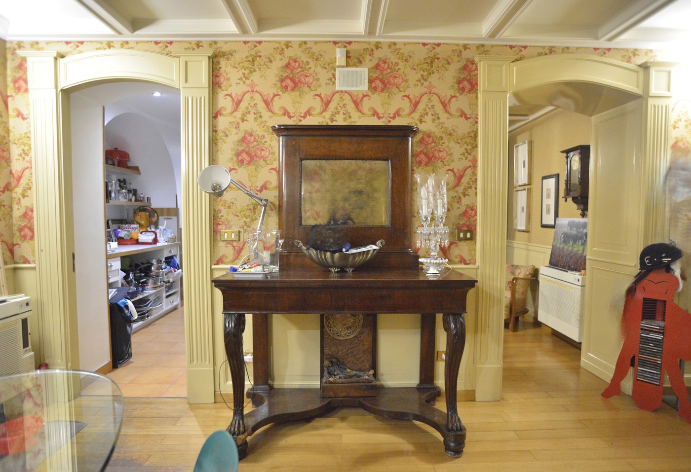 Due varchi gemelli, dagli eleganti profili lignei, esaltano la simmetria degli ambienti e collegano il salotto ad un piccolo ambiente (attualmente utilizzato come cabina armadio), e alla cucina affacciata sul cortile interno.