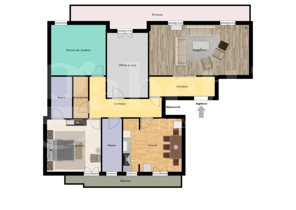 Completa la soluzione un comodo ripostiglio , che potrebbe anche essere utilizzato come cabina armadio a servizio di una delle camere da letto.