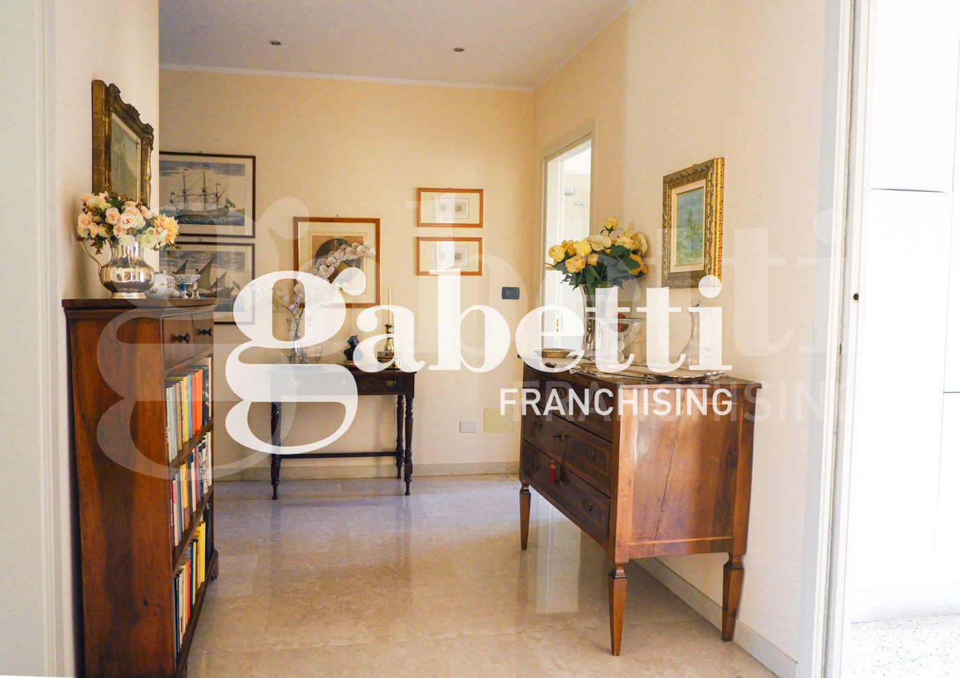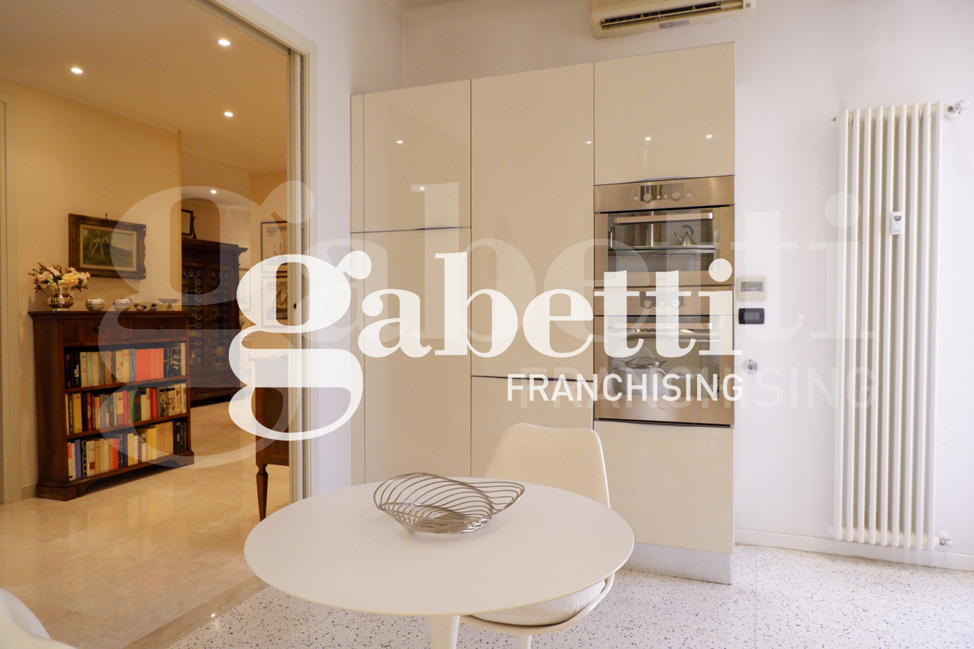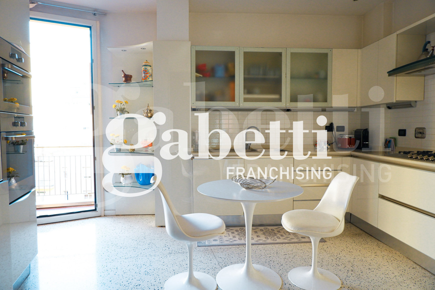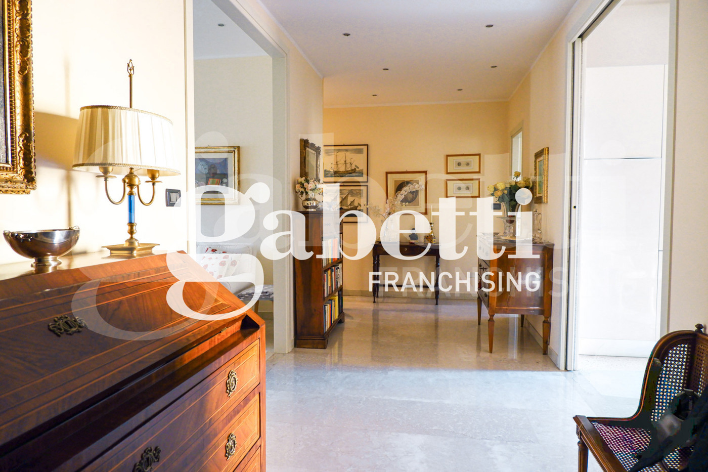Lappartamento, oggetto di una ristrutturazione completa nel 2005, si apre su un ingresso impreziosito da controsoffitti con illuminazione integrata che introducono alla zona giorno: ampio soggiorno doppio con pavimenti in marmo, librerie su misura e grandi finestre panoramiche, affiancato da una cucina abitabile, tutto servito da un bagno finestrato con materiali neutri e di qualit.