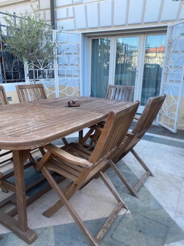 Dalla sala, attraverso un'ampia portafinestra, si accede alla corte piastrellata fronte mare , che a seconda delle esigenze potrebbe diventare un posto auto; sul retro vi è un'altra comoda resede.