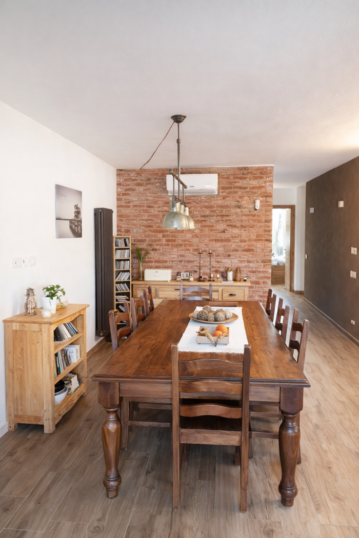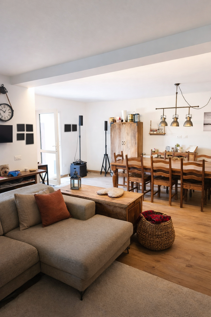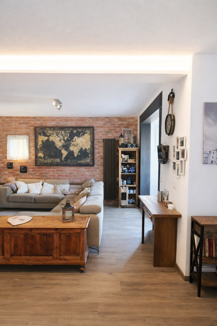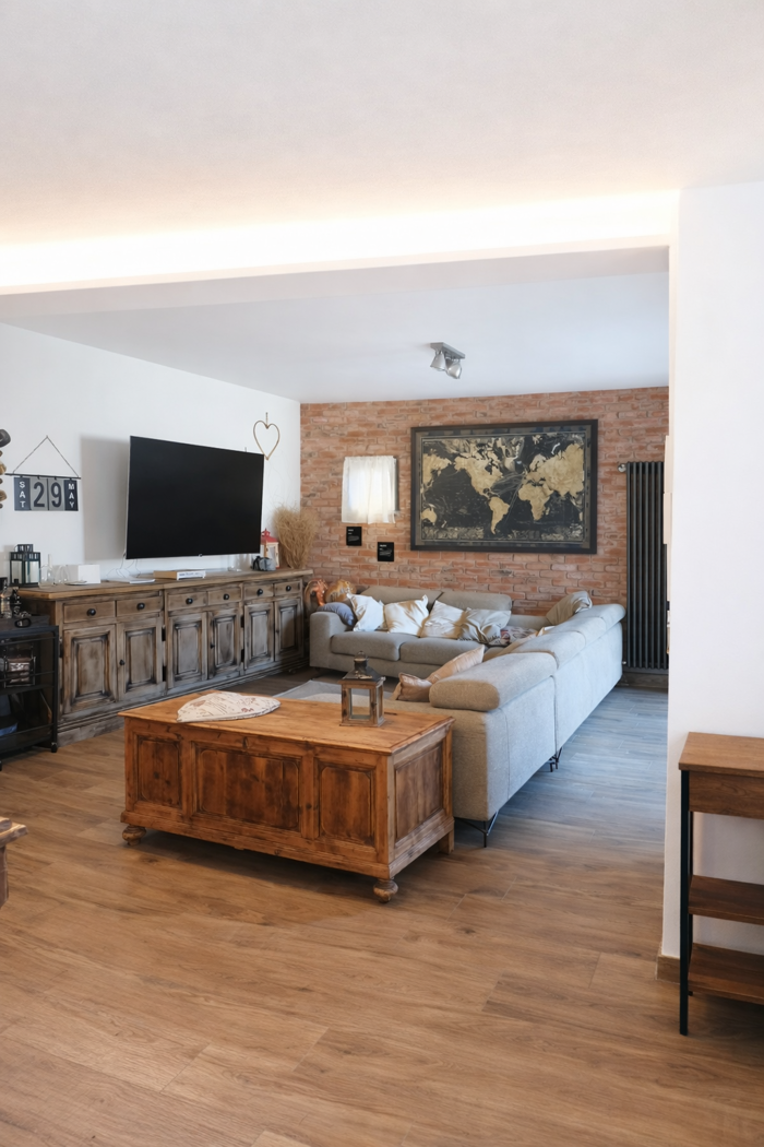 La cucina a vista e il soggiorno doppio creano un ambiente luminoso e spazioso, ideale per momenti di relax e convivialit.