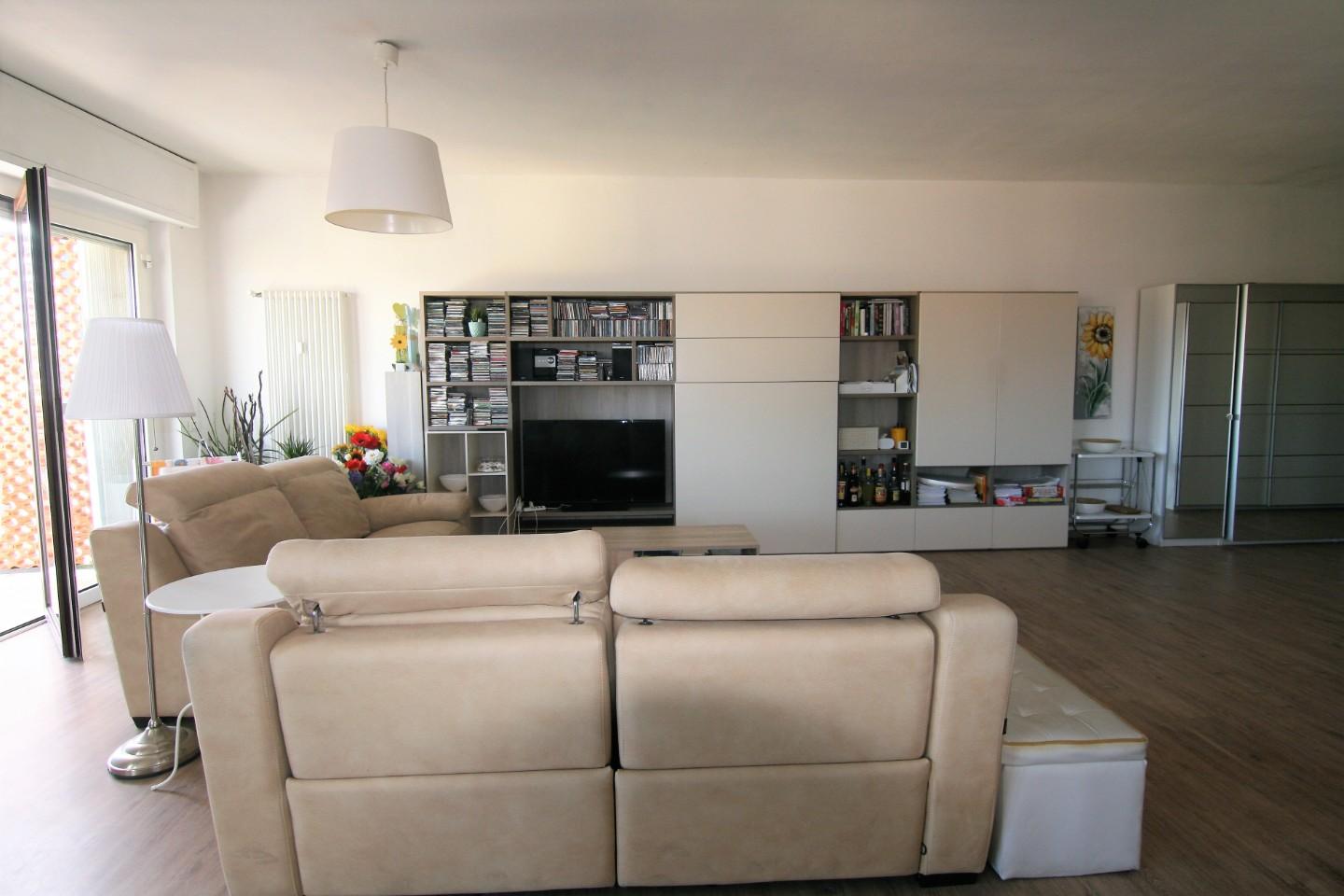 Ingresso, corridoio, ripostiglio/lavanderia di 10 mq, salone con zona living, zona cottura e zona pranzo di circa 80 mq, 2 camere matrimoniali, 2 bagni, 3 balconi, Garage di 30 mq, cantina e posto auto. Dalla grande zona giorno completamente aperta, se interessano gli ambienti chiusi, possibilità di ricavare una cucina grande abitabile ed addirittura una sala da pranzo adiacente inoltre, se necessita, si può facilmente ricavare una comoda terza camera.