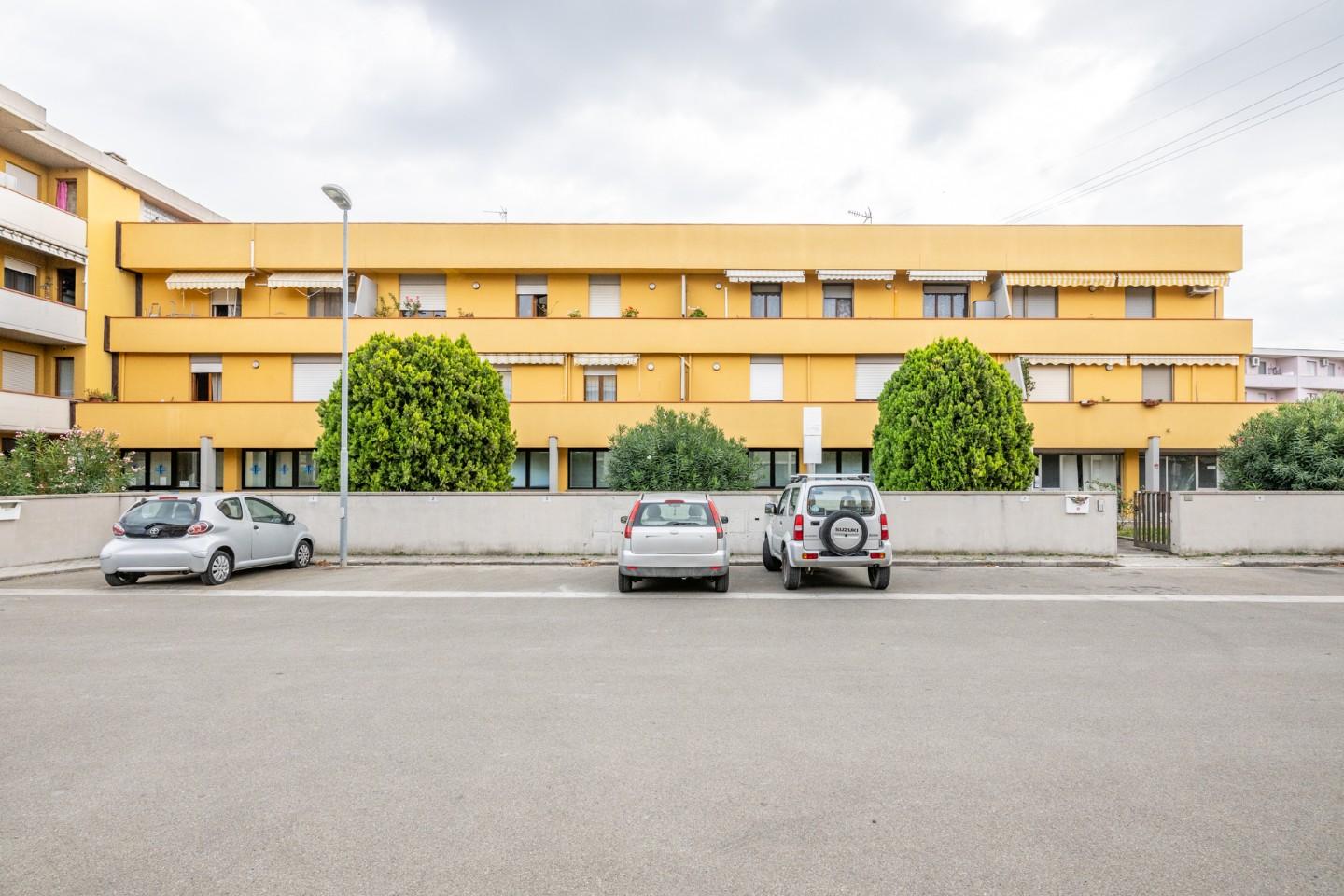 L'accesso allo stabile, sito in via del Volontariato a Cascina, avviene mediante strada privata, chiusa con sbarra automatica, e ulteriore cancello automatico, che delimita il giardino e il piazzale condominiali, dove si trovato i due posti auti assegnati all'appartamento.