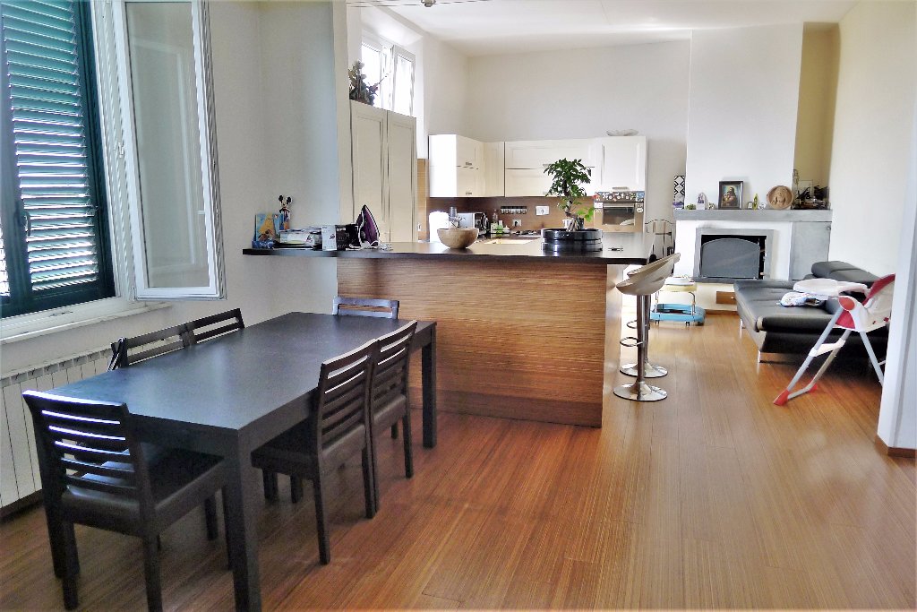 Posto a due passi dal centro, occupa l'intero ultimo piano di un fabbricato inizio secolo, composto da ingresso, soggiorno doppio con camino e cucina a vista ma divisibile, tre ampie camere e doppi servizi (attualmente una camera è utilizzata come lavanderia-stireria; al piano di sopra con accesso agevole si trova una grande mansarda divisa in due ambienti e ulteriormente divisibile con possibilità di aggiungere un bagno.