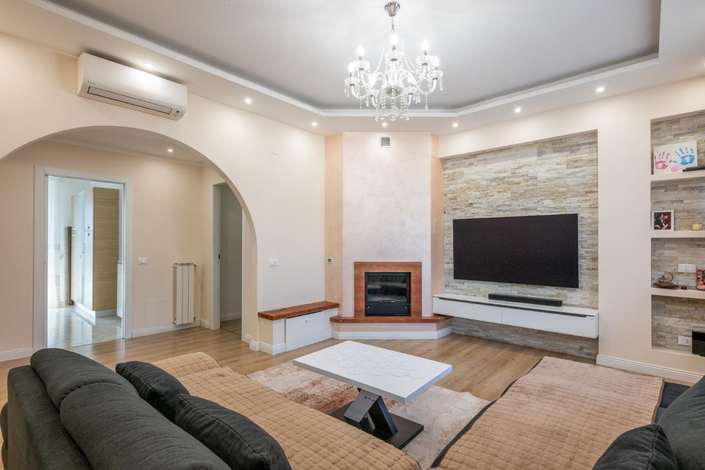 Lingresso tradizionale conduce a unampia e luminosa zona giorno, composta da un accogliente soggiorno con camino e accesso al terrazzo, oltre a una cucina abitabile con ripostiglio/lavanderia e ulteriore terrazzo.