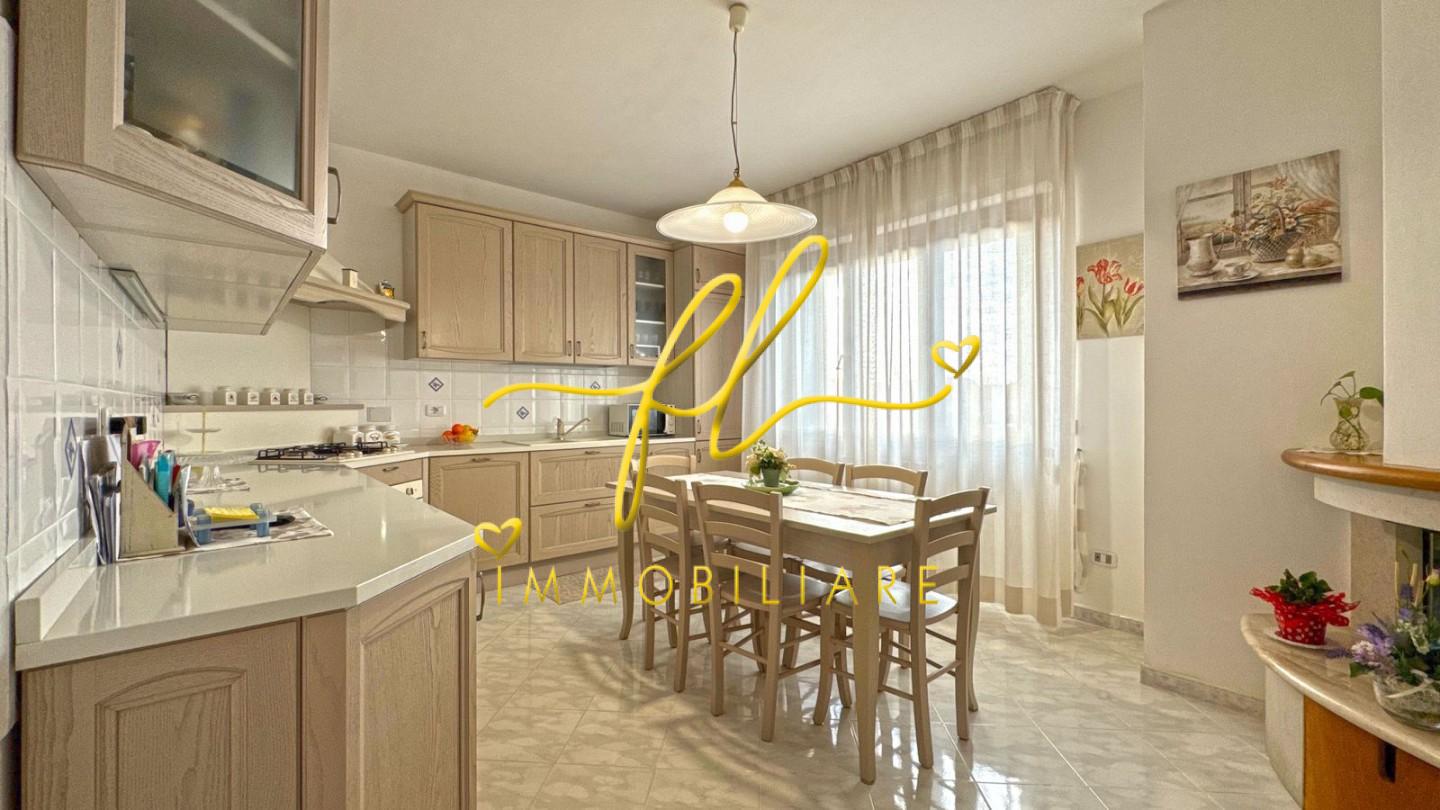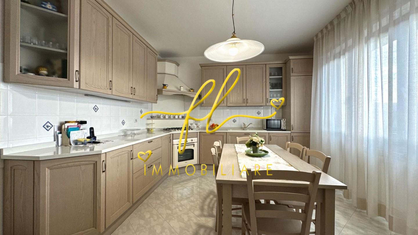 La cucina abitabile, ampia e di taglio classico-contemporaneo, è dotata di pratiche armadiature e zona pranzo.