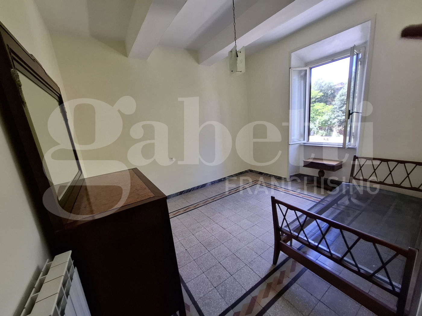 Gli ambienti padronali hanno soffitti con travi in legno e pavimenti d'epoca integri e originali.