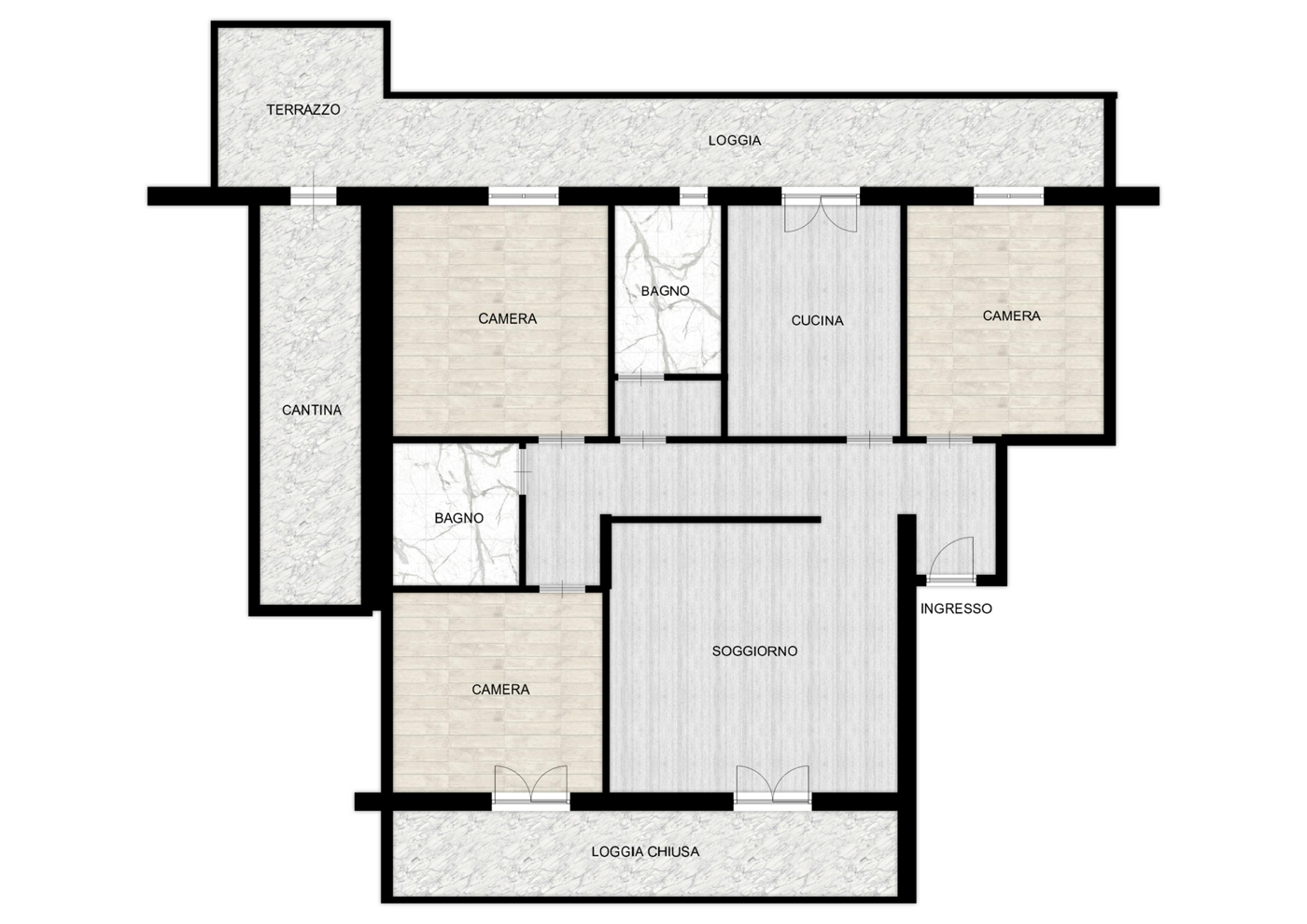 L'immobile composto da: ingresso, soggiorno, cucina abitabile, 3 camere, doppi servizi (uno con finestra), 2 logge di cui una chiusa, un terrazzino vivibile da cui si accede ad una cantina di circa 15 mq, ed un'altra cantina di propriet situata all'interno del caseggiato.