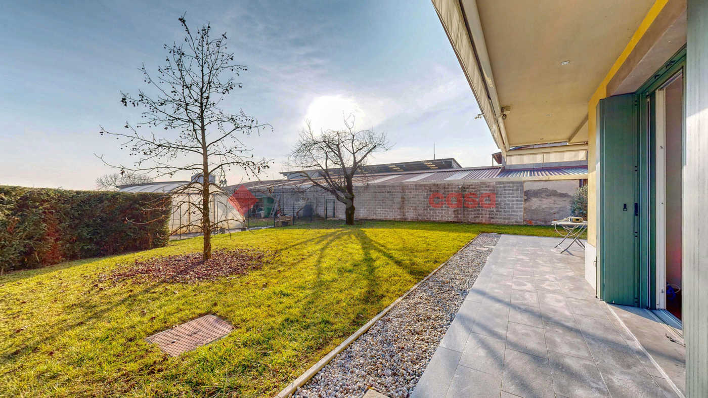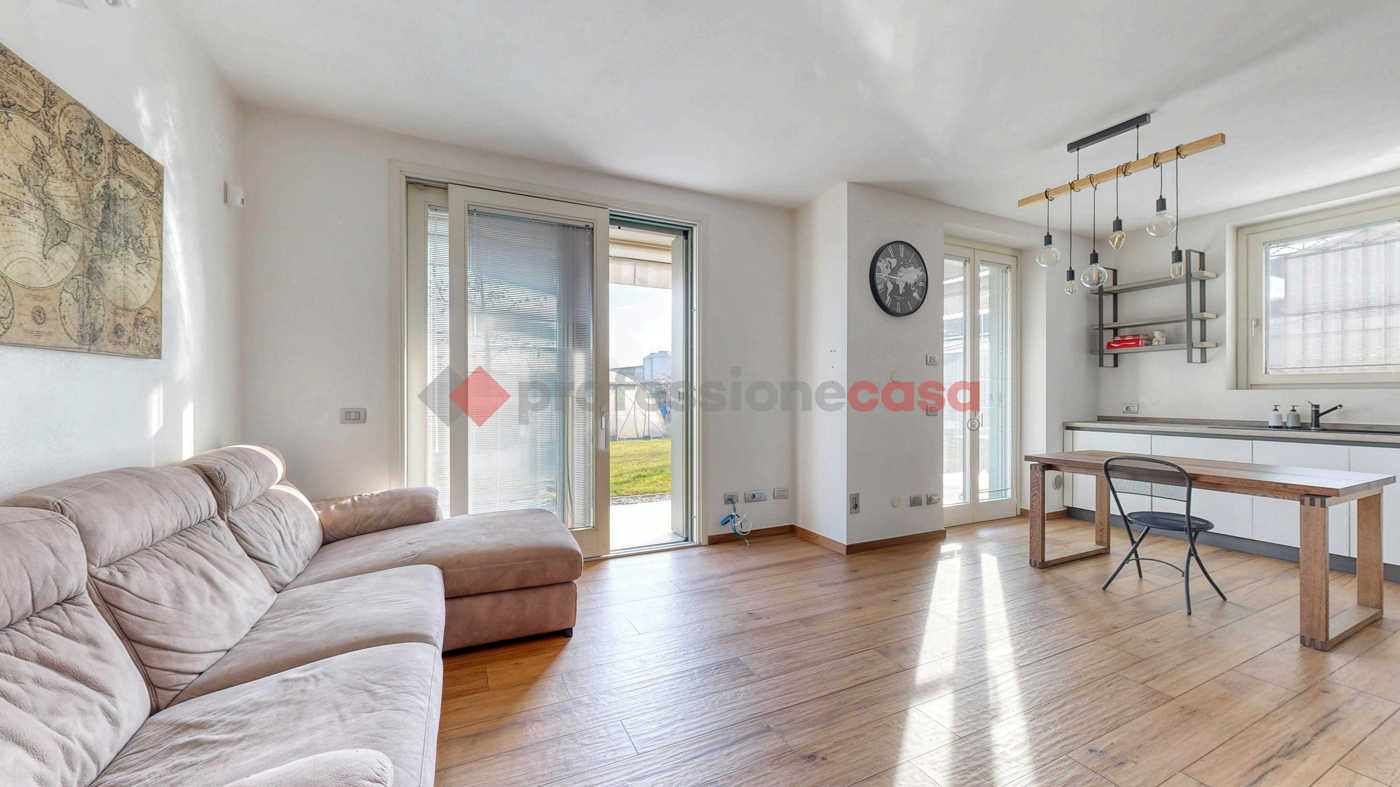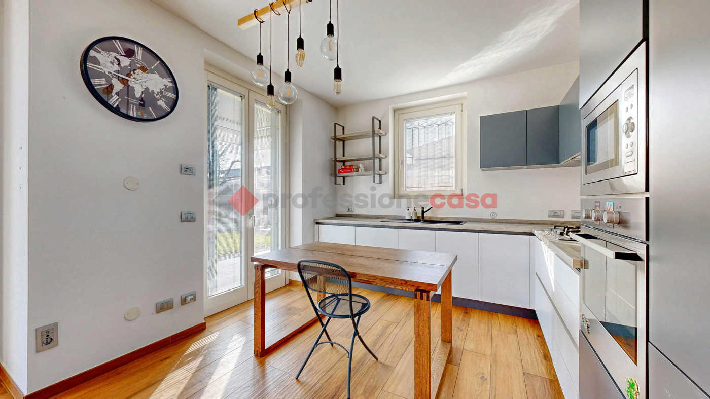 - Al piano terra troviamo un bilocale con soggiorno e cucina a vista con uscita diretta sul giardino privato, bagno, camera da letto matrimoniale, oltre a una taverna con ripostiglio e lavanderia.