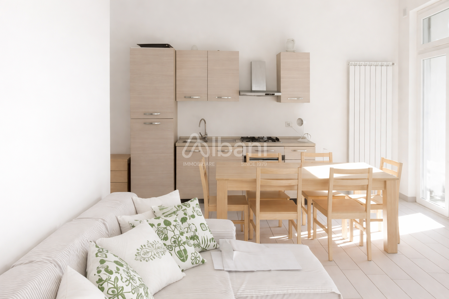 Lappartamento si sviluppa con spazi ben distribuiti e funzionali: lingresso conduce ad un ampio soggiorno, perfetto per momenti di relax e convivialità, con angolo cottura integrato, facilmente organizzabile e pratico per la vita quotidiana.