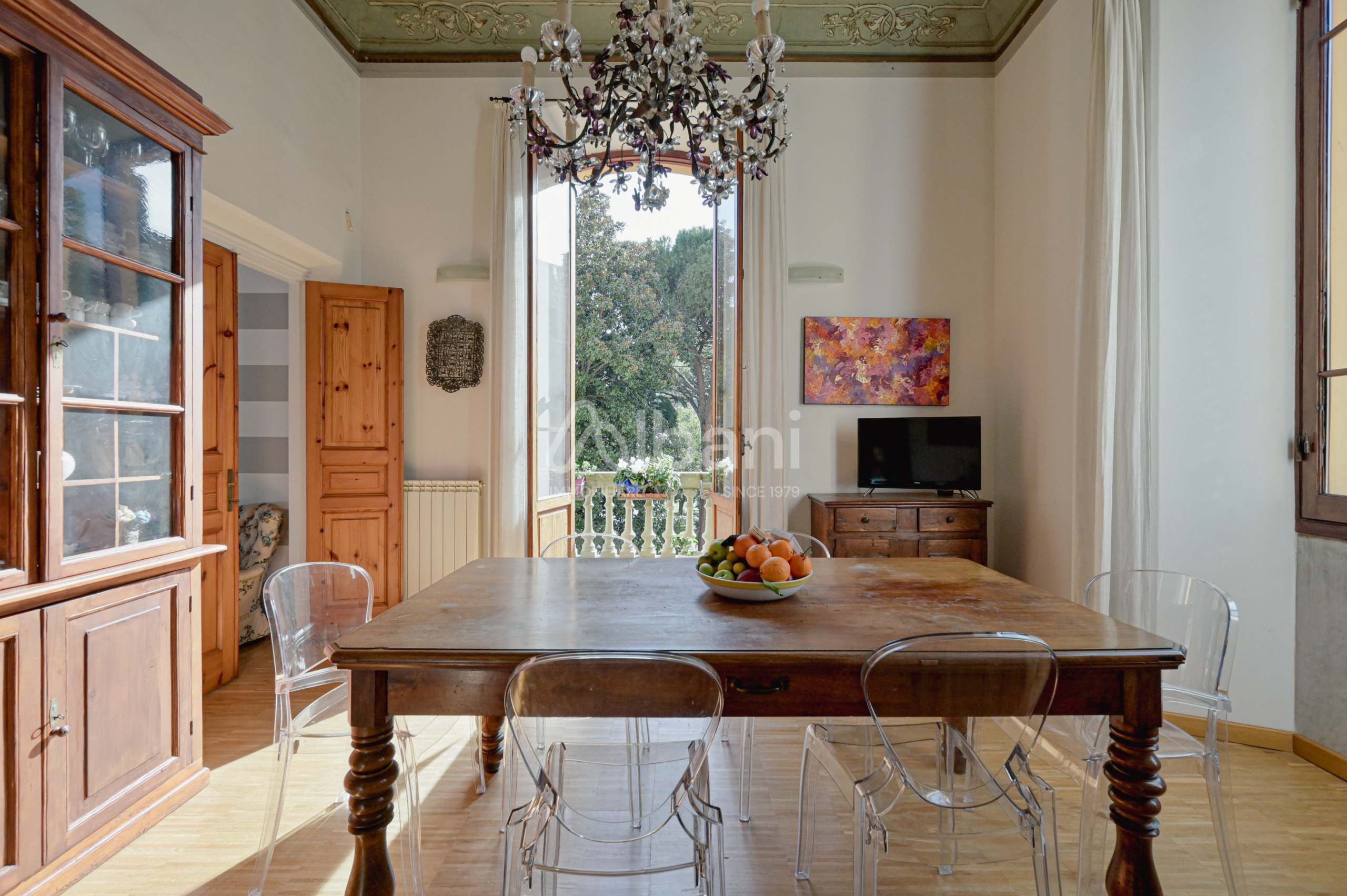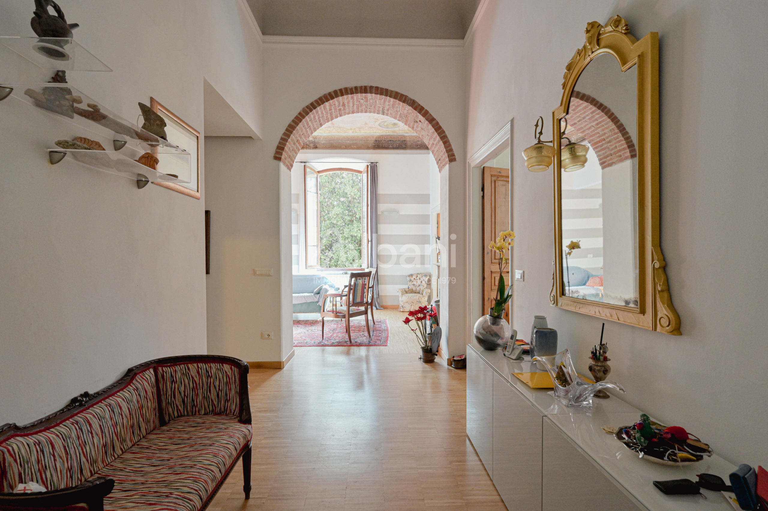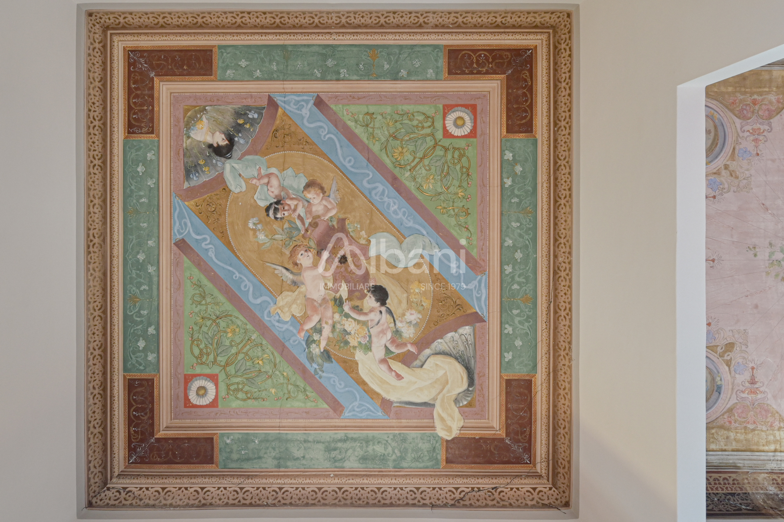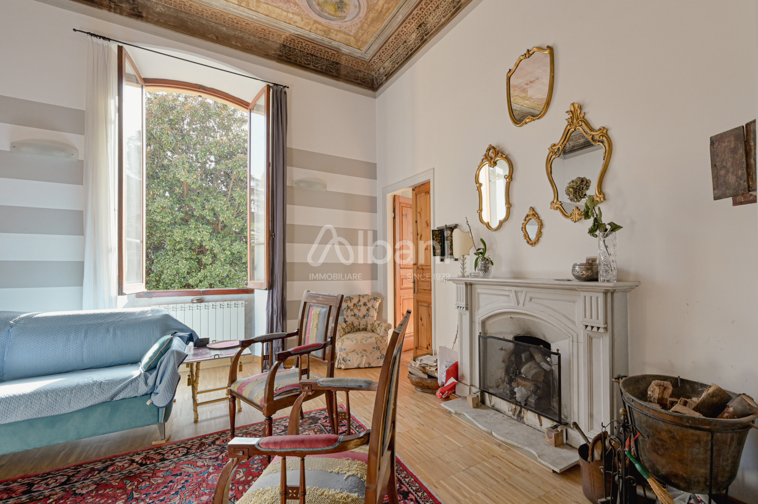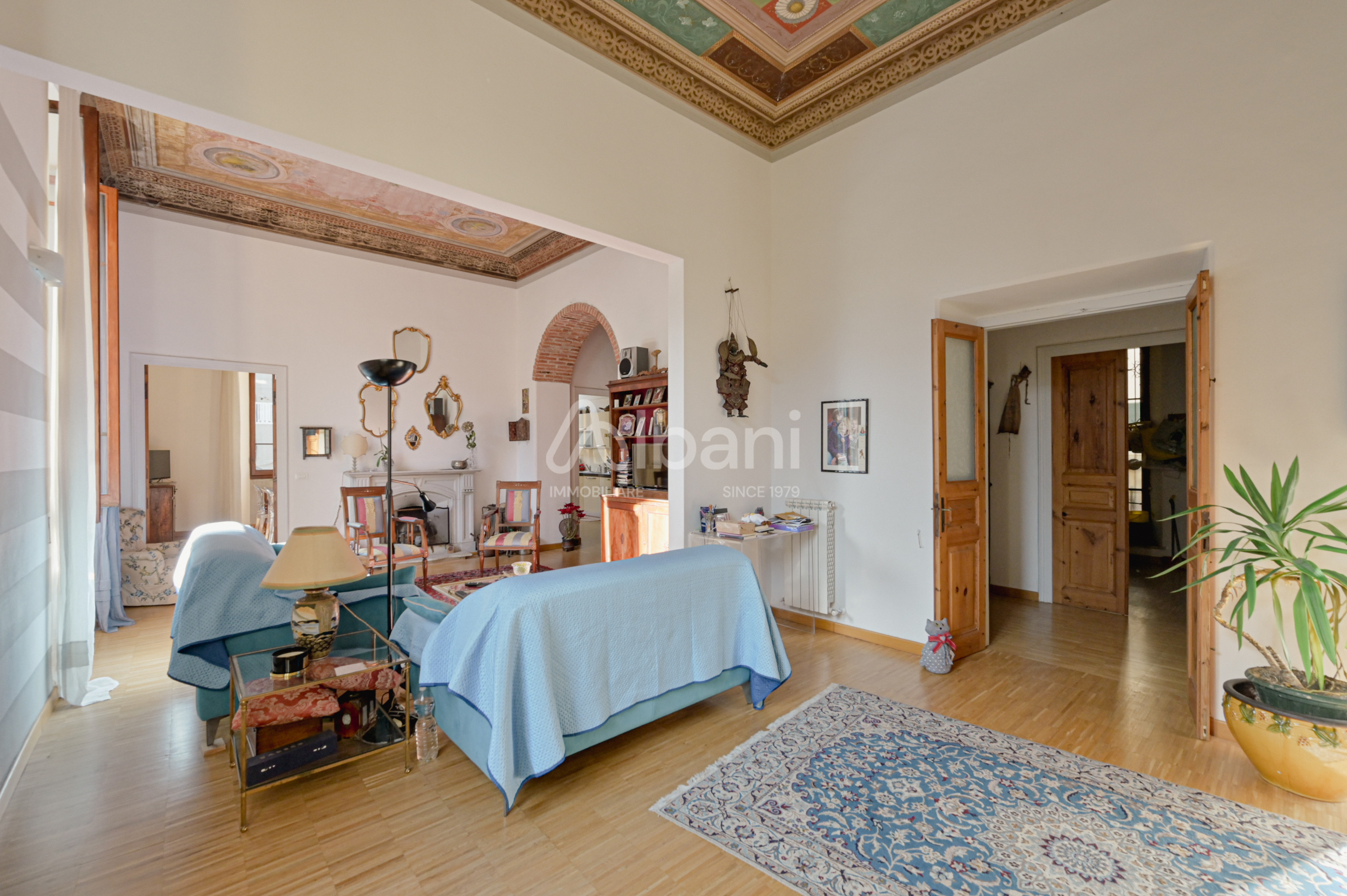 Limmobile, che nasce dalla fusione di due unità sullo stesso piano nobile dell'edificio, si distingue per grande fascino e rappresentanza, grazie ai magnifici soffitti affrescati, agli ambienti ampi e luminosi, alleleganza tipica delle dimore storiche dell'epoca.