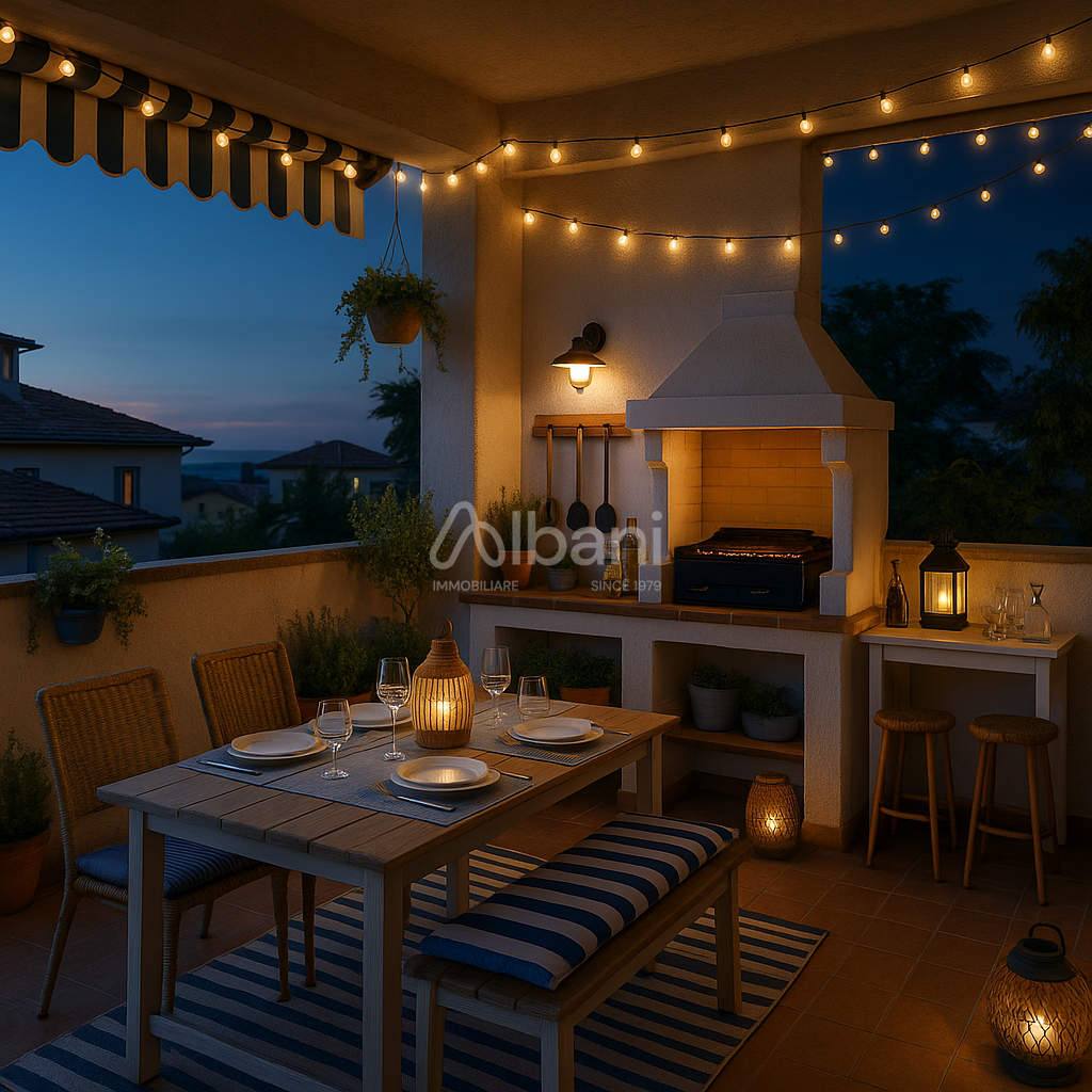 Internamente lappartamento è così distribuito: ingresso in disimpegno, doppio salone, spaziosa cucina abitabile con accesso a balcone loggiato attrezzato con barbecue, luce ed acqua, uno spazio ideale per pranzi allaperto e momenti di relax, tre camere da letto, uno studio, due cabine armadi, due bagni.