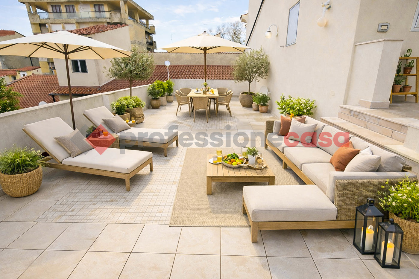La Zona Giorno e' composta da una Cucina Abitabile con Balcone, una Sala da pranzo, un bellissimo Salone doppio (3 finestre), lo Studio da cui si accede alla Terrazza Abitabile di circa mq.60, Ripostiglio ed un terzo Bagno ad uso lavanderia.