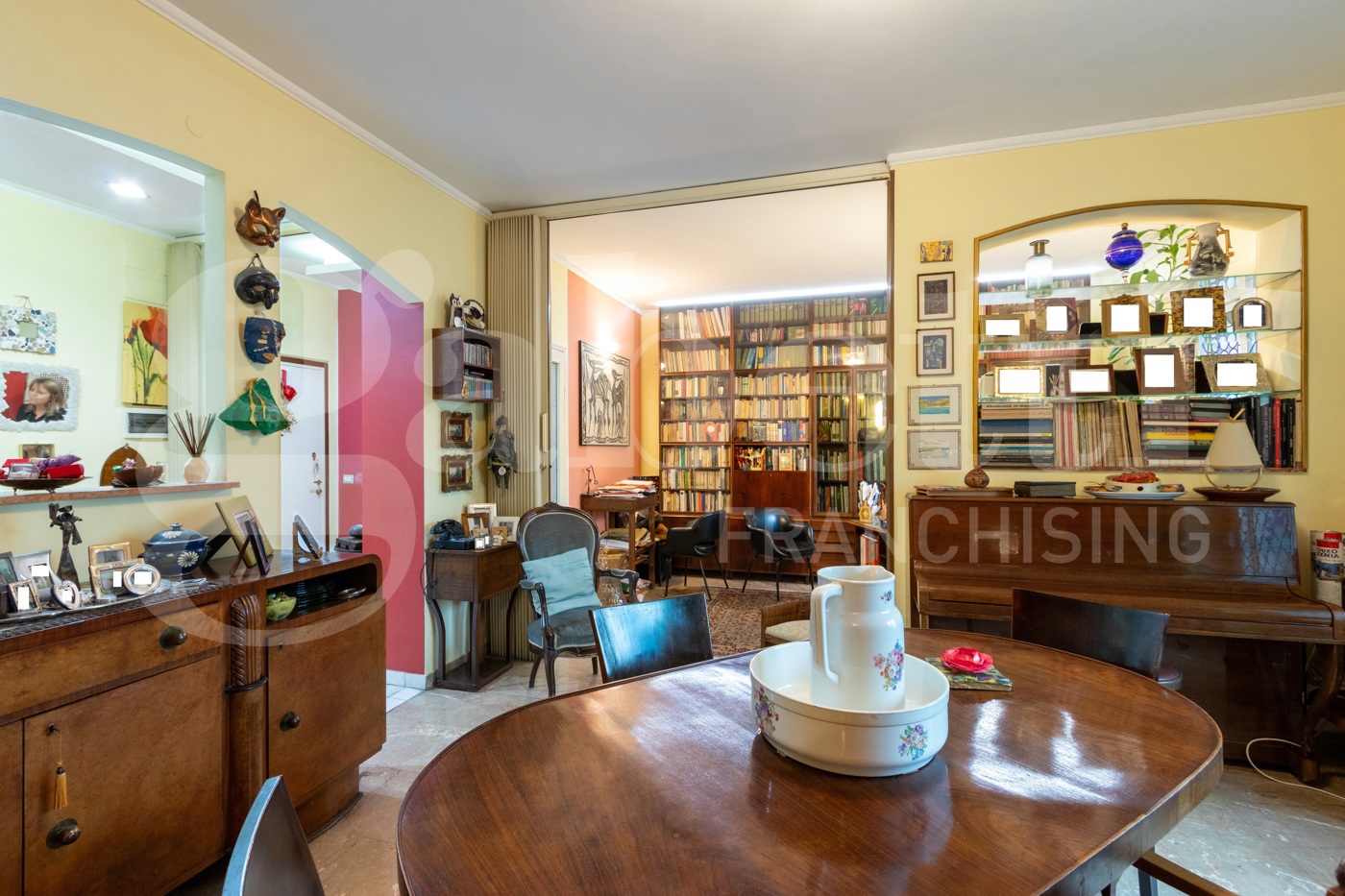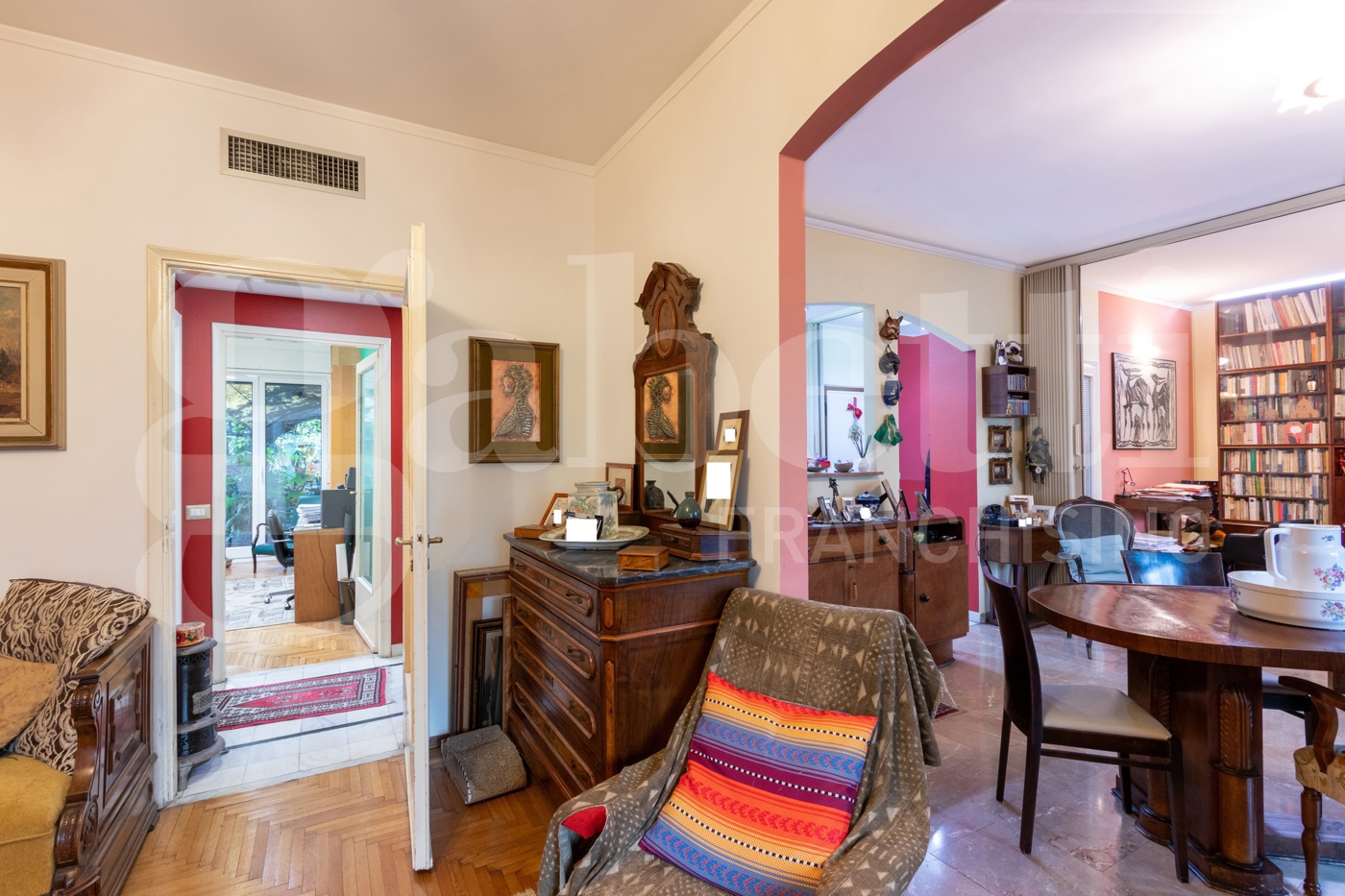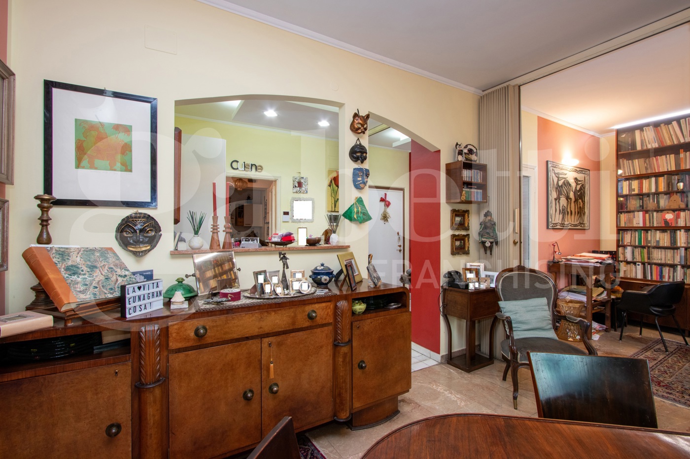 Lampia metratura complessiva di 182 mq cos distribuita : un soggiorno doppio, attualmente collegato ad una ulteriore grande camera che funge da studio ; unampia cucina abitabile doppiamente finestrata, ulteriori tre camere ; tre bagni, due dei quali ristrutturati in epoca recente; un comodo ripostiglio.