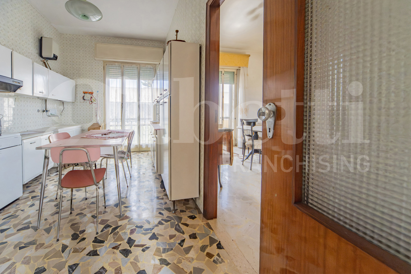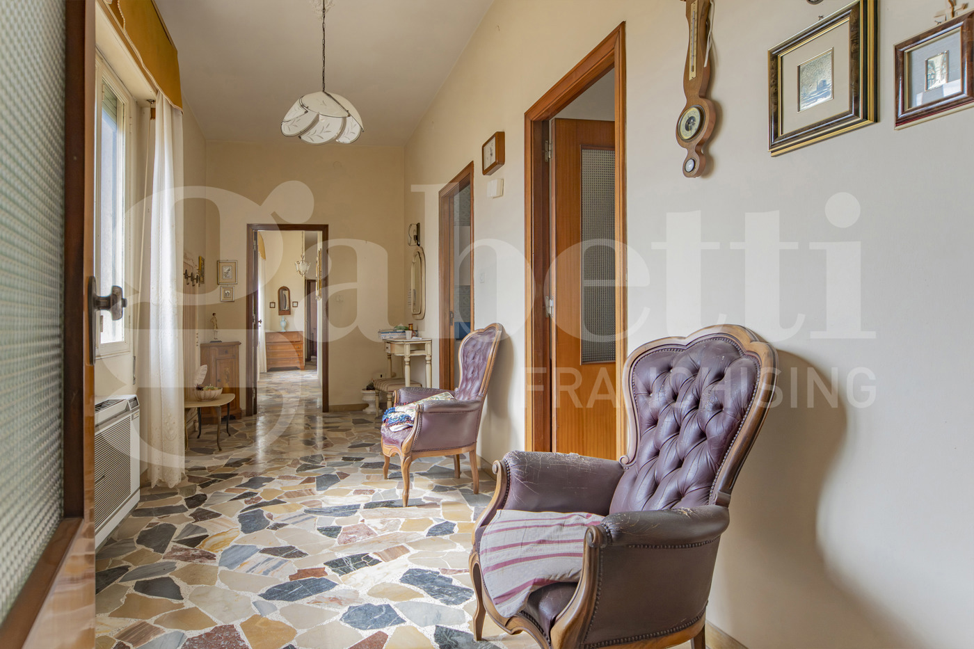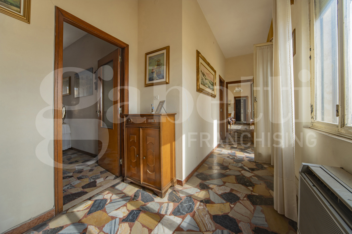 . Lappartamento si sviluppa su una superficie ampia e ben articolata, ed attualmente composto da: ingresso, sette camere di dimensioni comode e regolari, facilmente adattabili a diverse esigenze abitative, cucina abitabile, due bagni finestrati, pratico ripostiglio e due balconi che garantiscono sfogo esterno e buona luminosit agli ambienti.