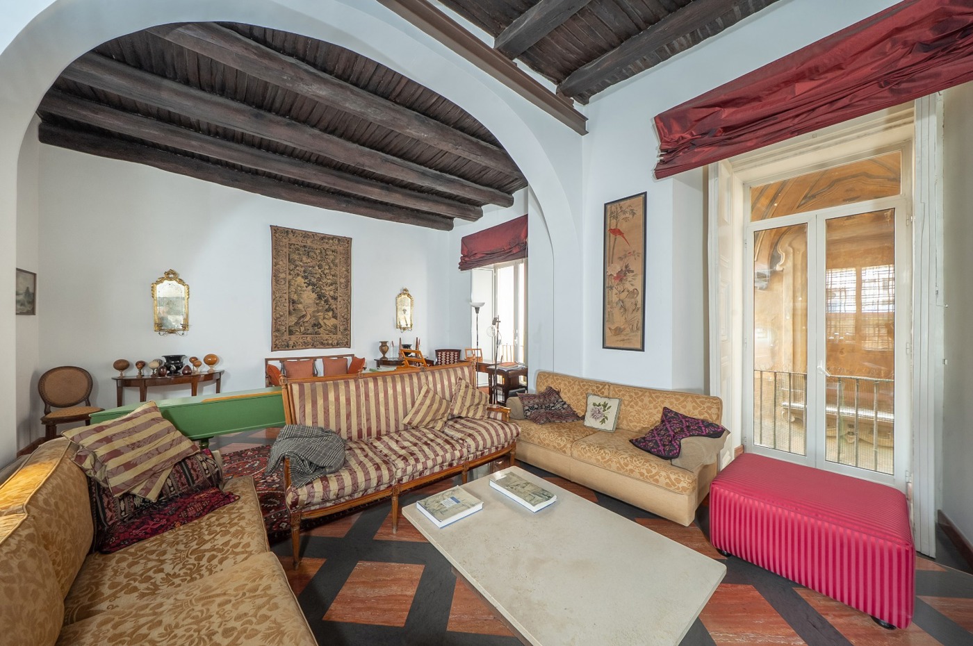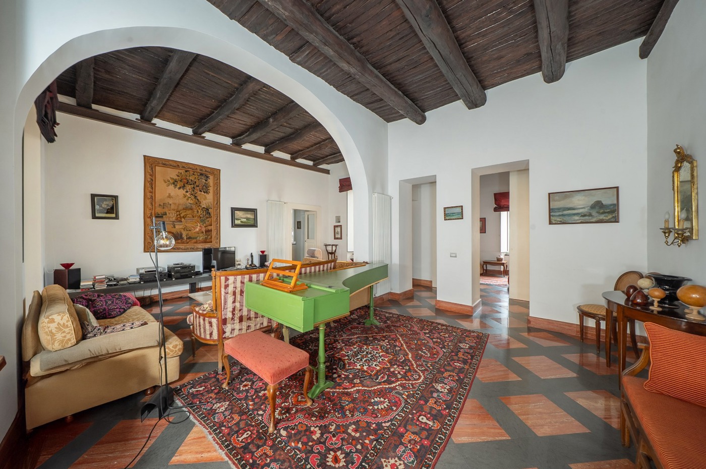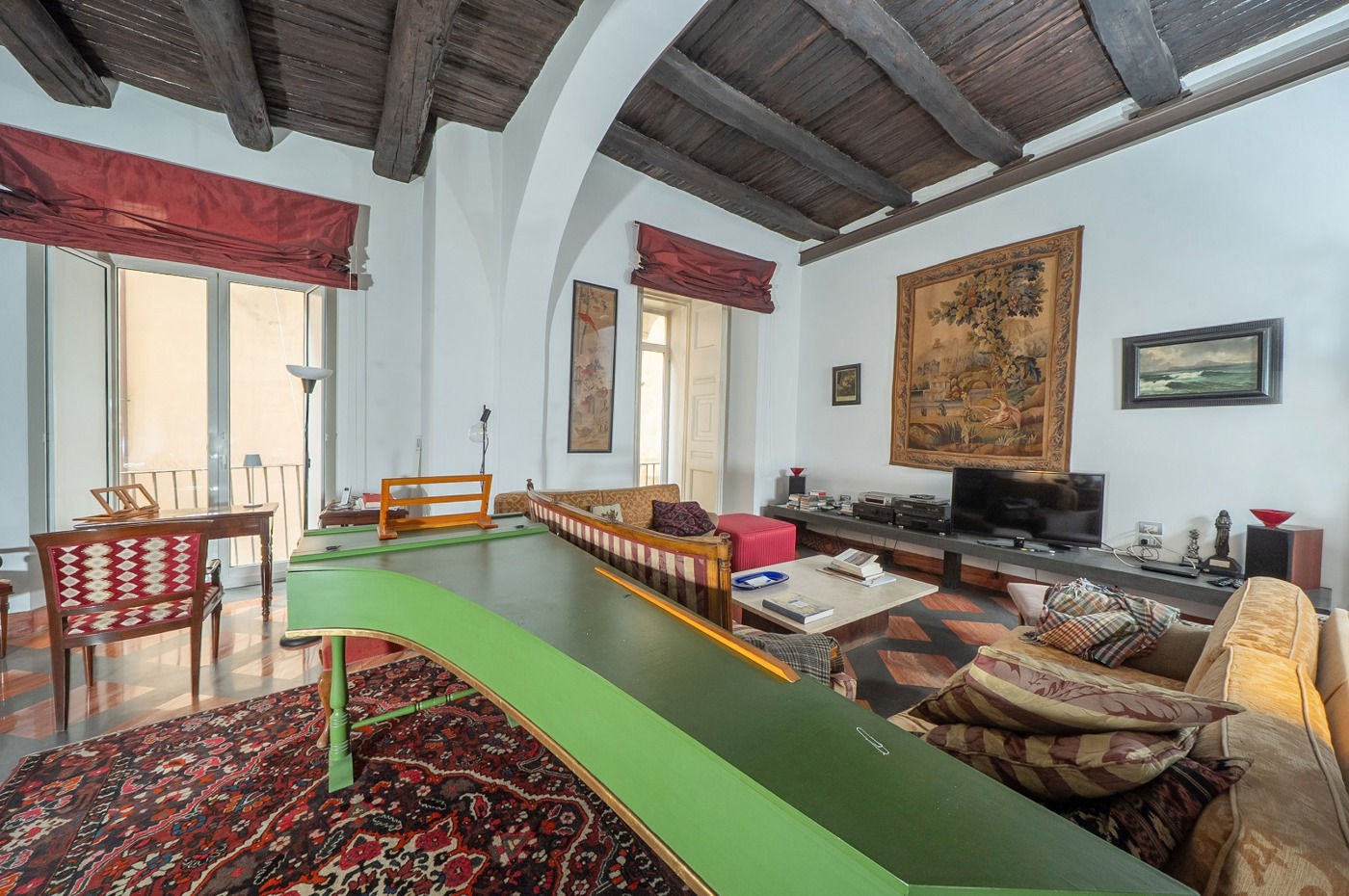 Zona di rappresentanza caratterizzata da un salone doppio con due balconcini riservati e luminosi, dai quali si gode una suggestiva vista sul campanile del Complesso Monumentale di San Gregorio Armeno, elemento architettonico che collega chiesa e monastero e che conferisce unicit prospettica allimmobile.