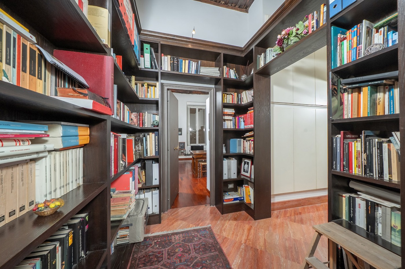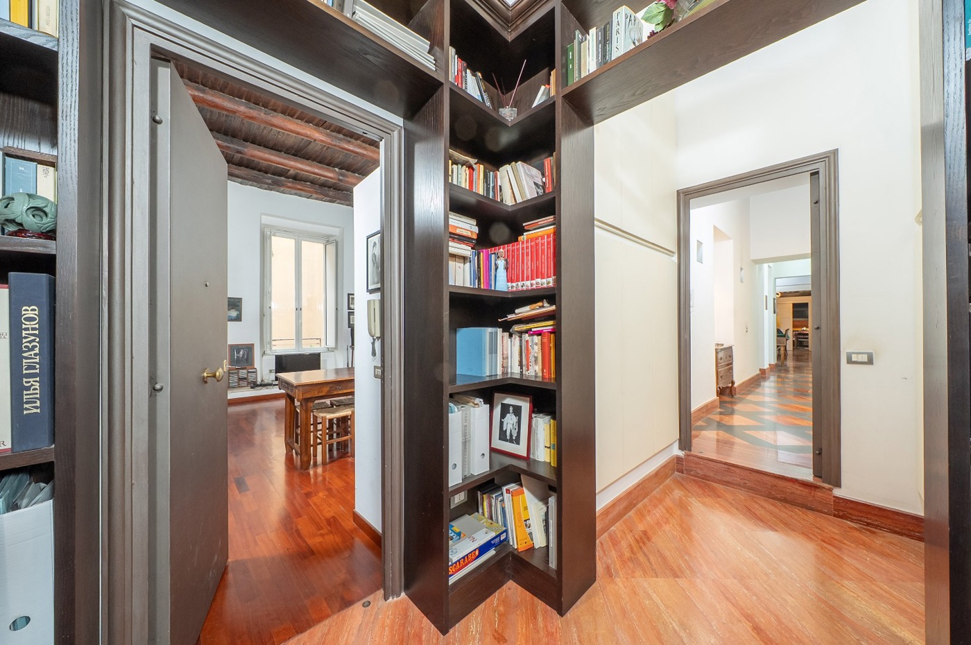 Lingresso impreziosito da unelegante libreria introduce a una distribuzione funzionale e raffinata degli spazi.