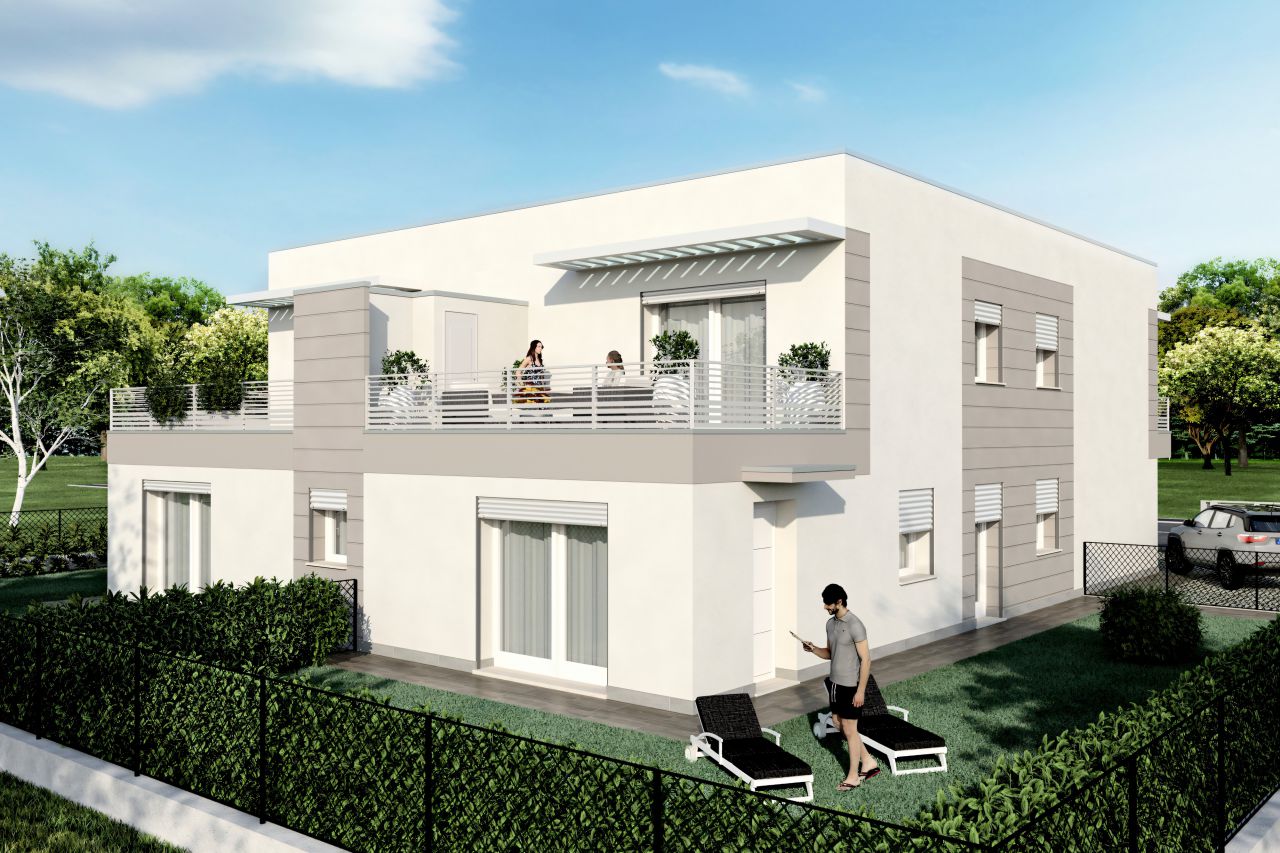 ( in vendita 3 appartamenti) Al piano terra si trovano due unità abitative con ingresso indipendente e giardino esclusivo, ciascuna composta da un soggiorno con angolo cottura, due camere da letto e doppi servizi.