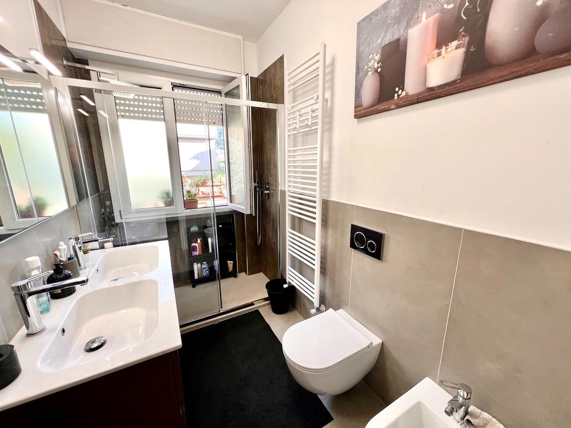 Presenti due bagni moderni, 1 con doccia, l' altro di servizio con lavabo e wc. Lappartamento dispone complessivamente di vari balconi di medie dimensioni e di una splendida terrazza sul tetto, di circa 30 mq, in parte adibita a lastrico solare, dotata di impianto fotovoltaico e batteria di accumulo, per un eccellente risparmio energetico.