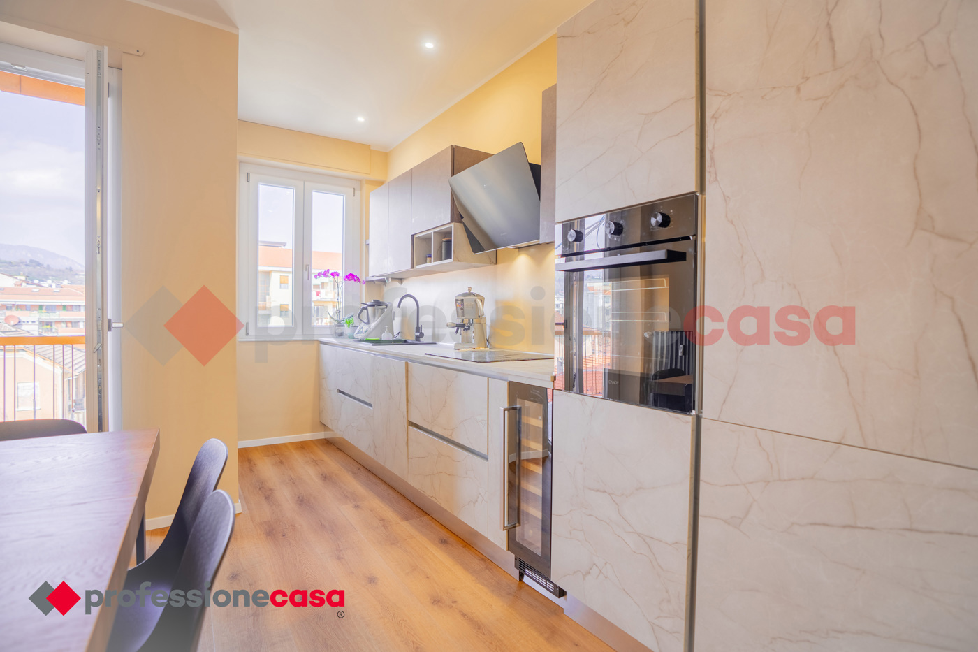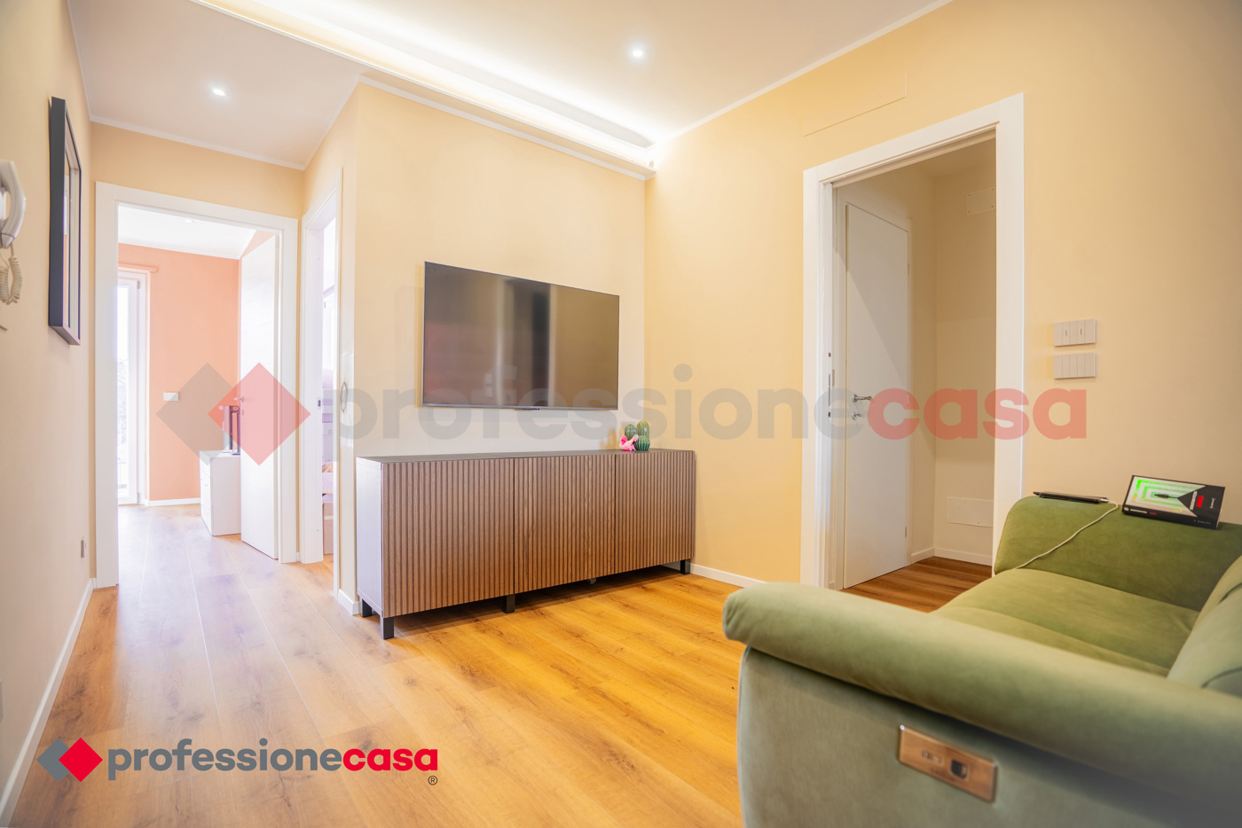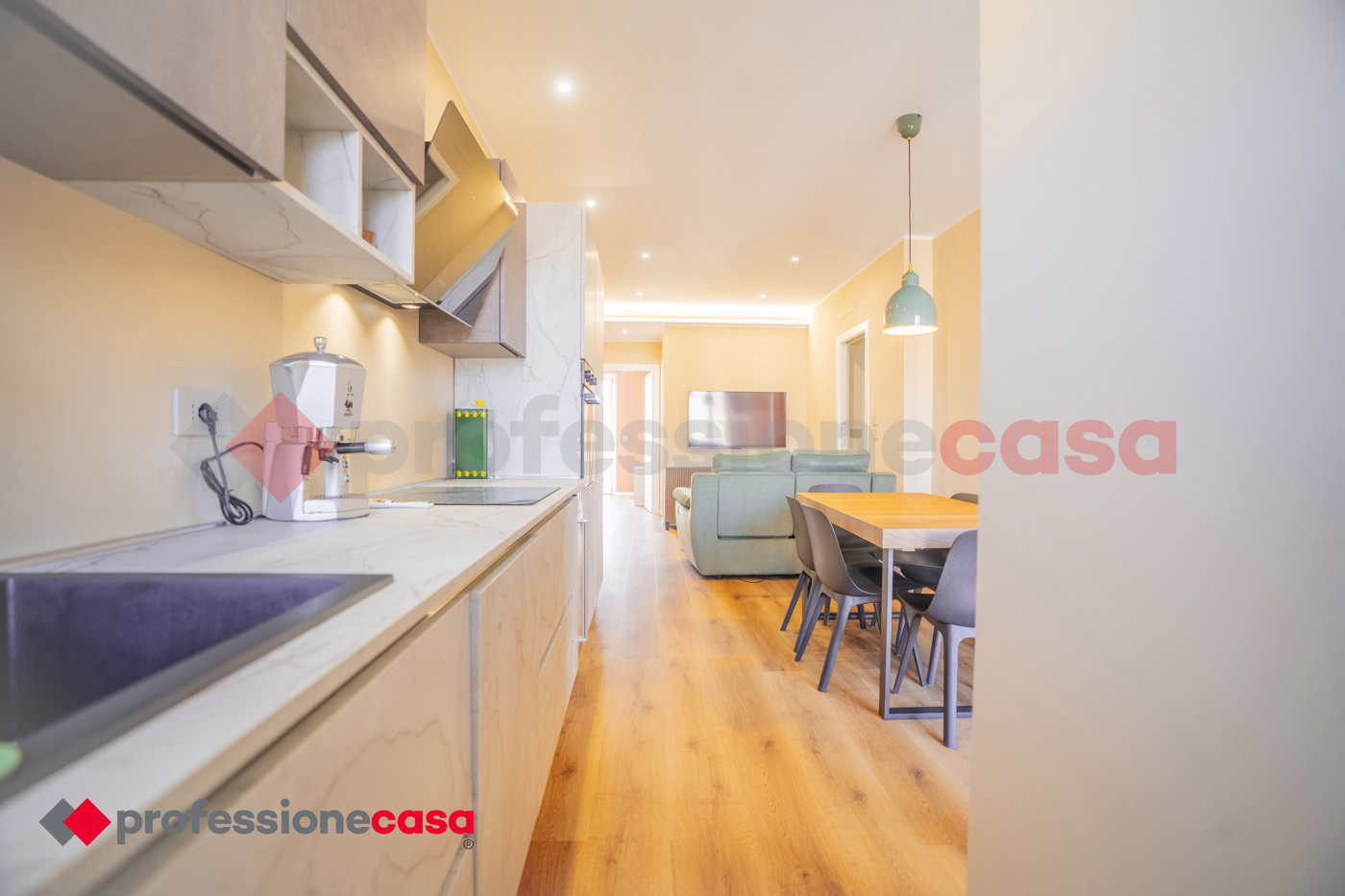 Lingresso si apre su una luminosa zona giorno con cucina a vista, ideale per momenti di relax e convivialit.