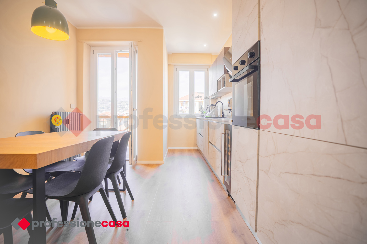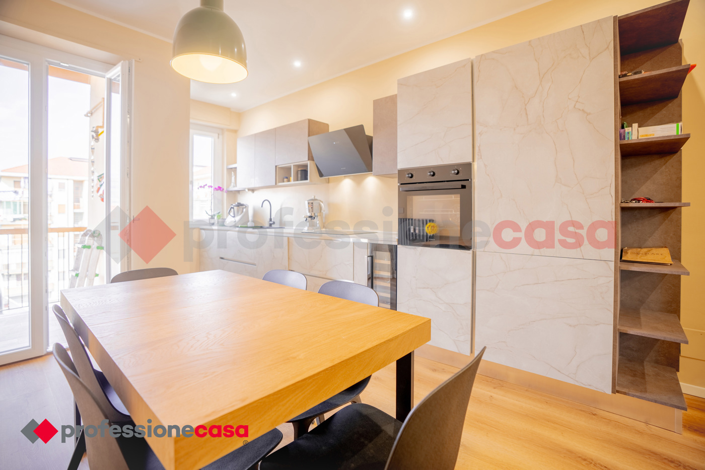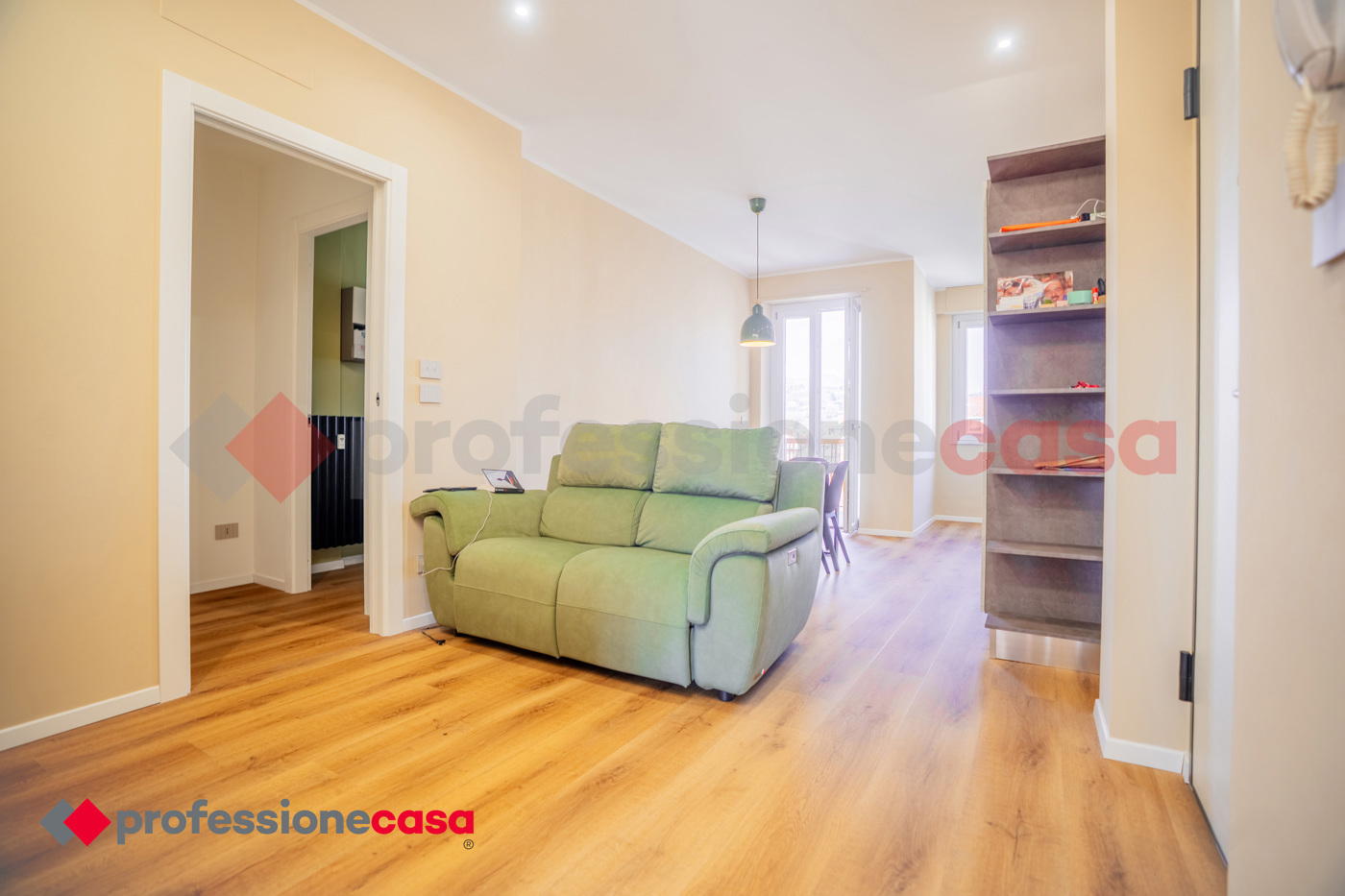 Lingresso si apre su una luminosa zona giorno con cucina a vista, ideale per momenti di relax e convivialit.