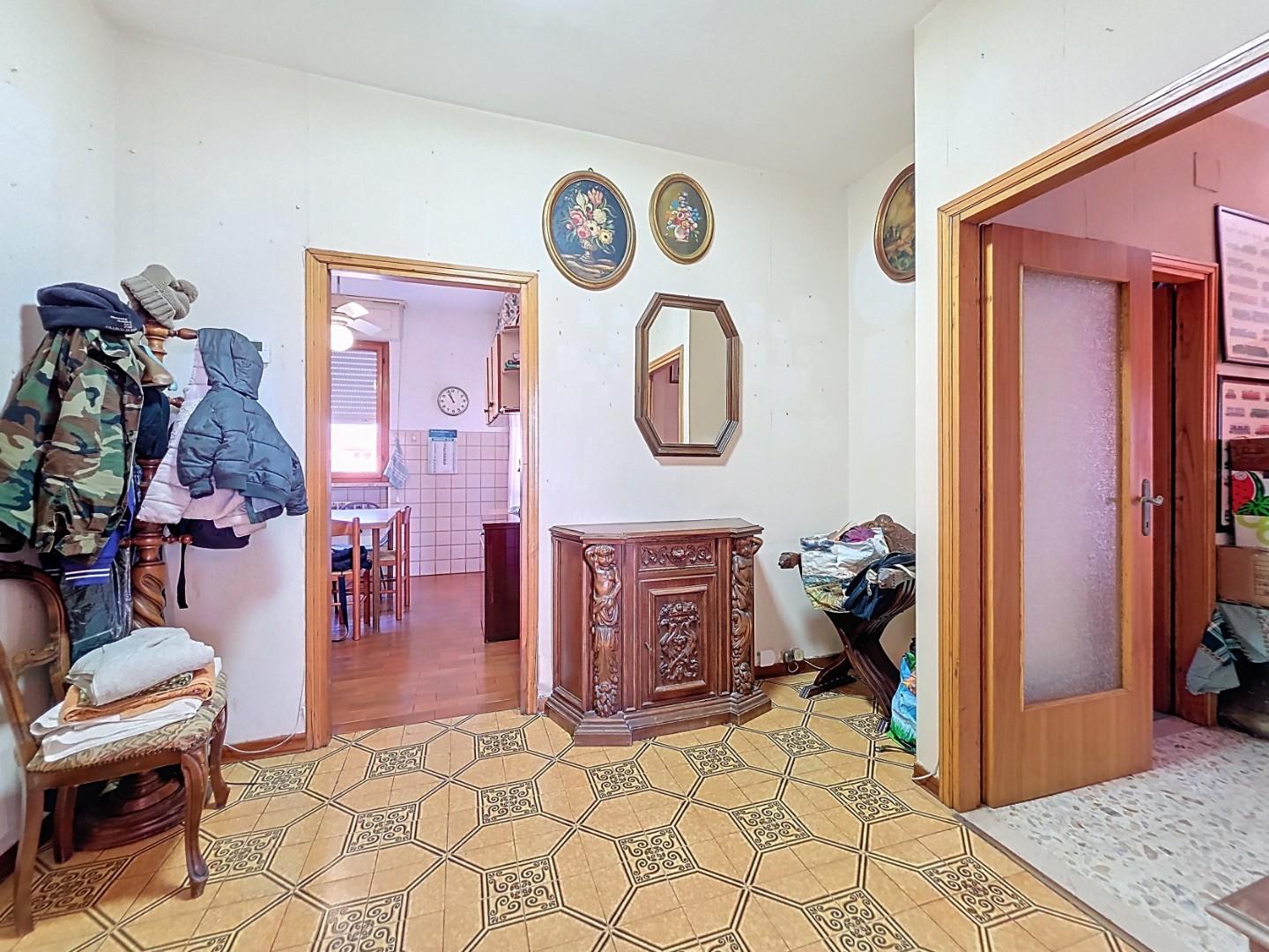 Ci accoglie un comodo ingresso tradizionale che ben separa l'ampio e luminoso soggiorno con balcone dalla cucina corredata anche essa da altro balcone.