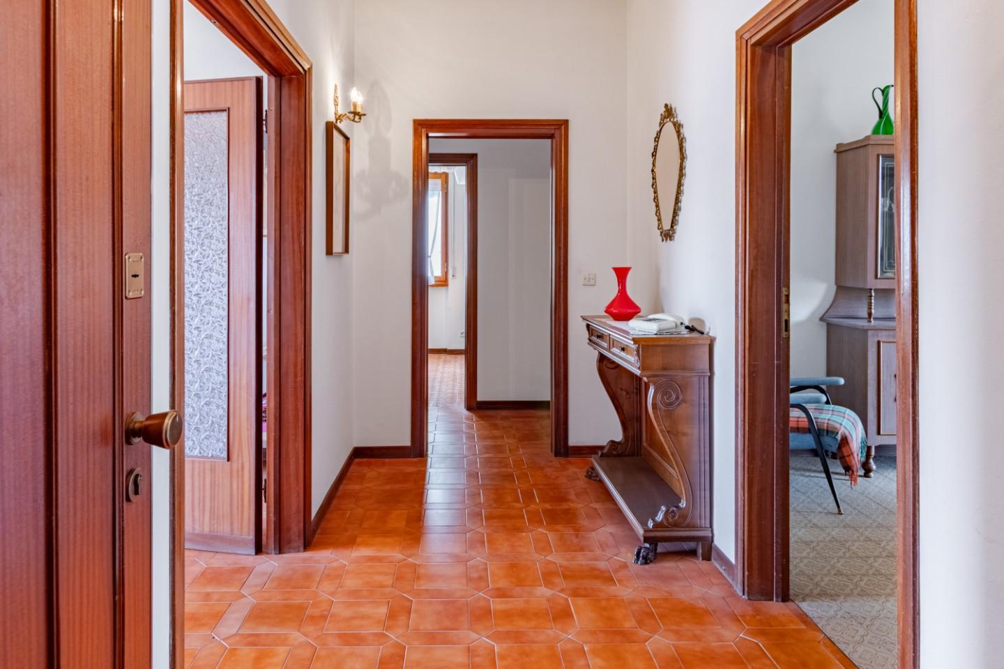 Lingresso tradizionale accompagna in un ampio corridoio che distribuisce in modo funzionale tutti gli spazi: grande soggiorno con accesso al balcone, cucina abitabile, anchessa con balcone, tre camere da letto di generose dimensioni, perfette sia per una famiglia che per un investimento a reddito, bagno finestrato con vasca, secondo bagno di servizio, comodissimo nella vita quotidiana.