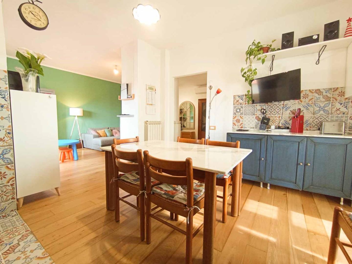***.*******.** 1280 - LUMINOSO 5 VANI CON GARAGE, CAMINO E VISTA PANORAMICA In posizione strategica, vicina a tutti i principali servizi ??, proponiamo in vendita ampio appartamento di 5 vani situato in una piccola palazzina anni 70 di sole 6 unità familiari ?, in contesto tranquillo e ben curato ?. Posto al terzo ed ultimo piano ?, limmobile si distingue per la sua eccezionale luminosità , garantita dalla doppia esposizione sud-est, e per una piacevole vista aperta e panoramica ?. Lingresso, tramite portone blindato ?, conduce a unaccogliente zona giorno dove troviamo: ? soggiorno con balcone impreziosito da uno splendido camino ?, perfetto per creare unatmosfera calda e familiare ? cucina abitabile a vista, leggermente defilata, con accesso a balcone verandato di servizio Lintera pavimentazione in listoni di legno naturale ? dona continuità agli ambienti e crea unatmosfera calda, elegante e avvolgente , rendendo ogni spazio ancora più accogliente.