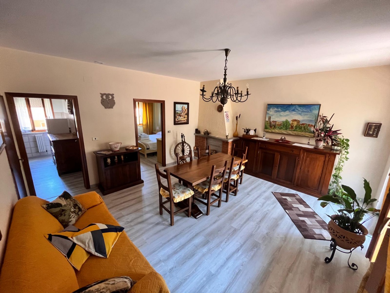 L'appartamento dispone di cinque locali ben distribuiti: una spaziosa sala con camino, perfetta per le serate invernali, una cucina funzionale, tre camere da letto e due bagni.