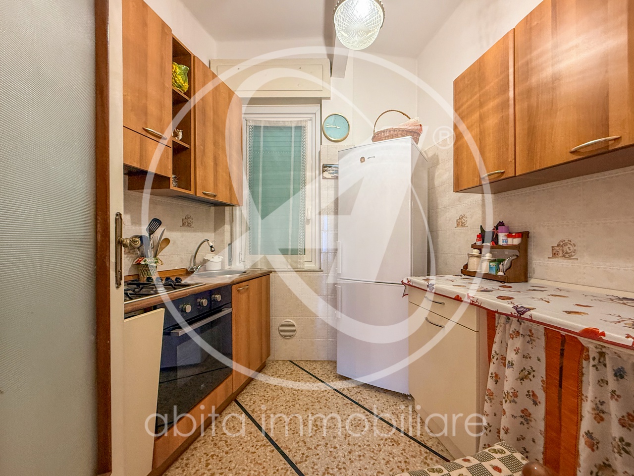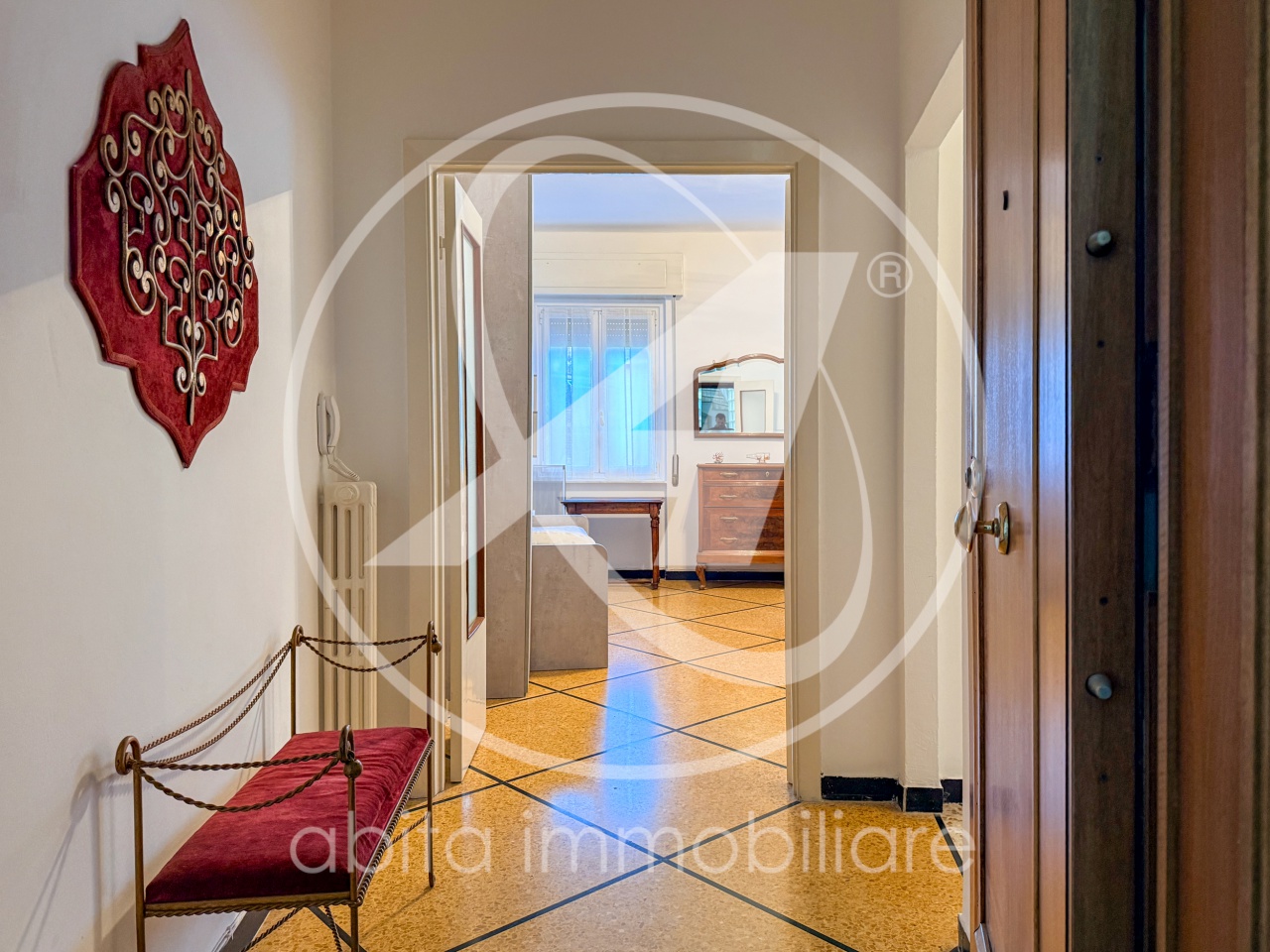 L'appartamento si presenta molto funzionale e offre spazi generosi, ideali sia come prima casa che come confortevole abitazione al mare. *Ingresso ampio e arredabile *Soggiorno luminoso con uscita sul balcone *Cucinotto separato *Due camere da letto matrimoniali *Studio / terza camera *Due bagni (uno finestrato con vasca, uno con doccia e zona lavanderia) *Ampio balcone sul soggiorno *Ripostiglio *Cantina al piano seminterrato Gli interni conservano dettagli originali dell'epoca, come il parquet a spina di pesce nella zona giorno e i pavimenti alla genovese nelle camere, che possono essere valorizzati nell'ambito di una eventuale ristrutturazione.