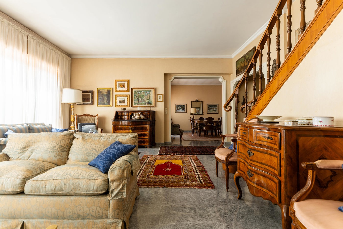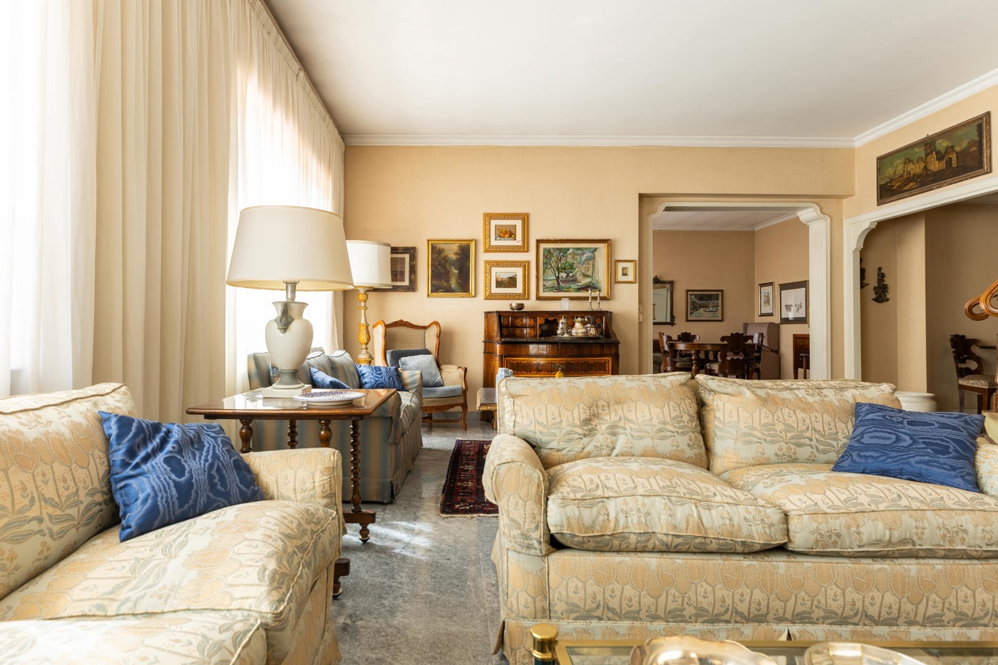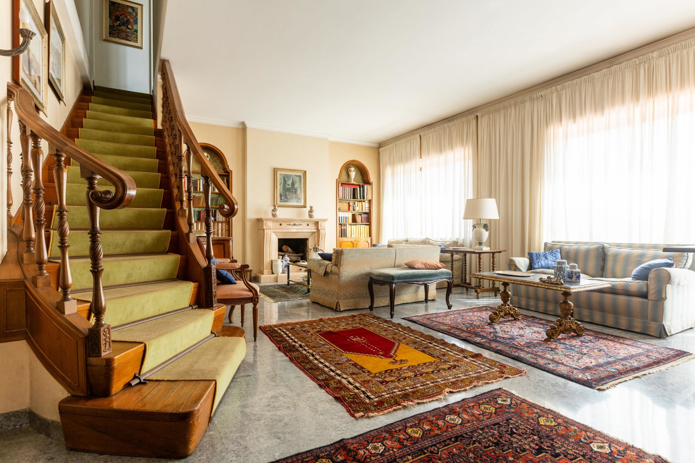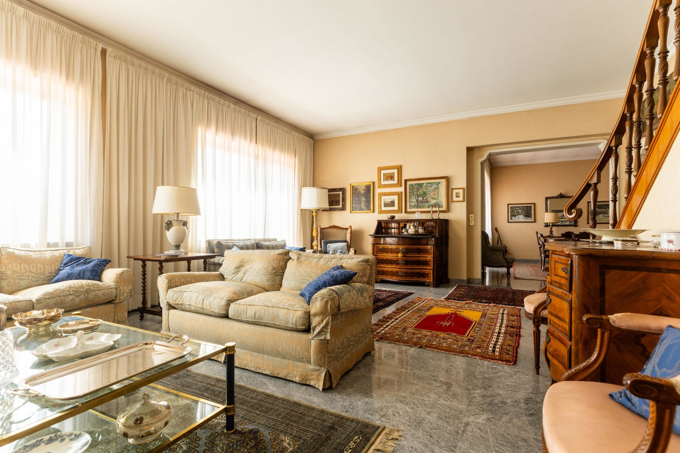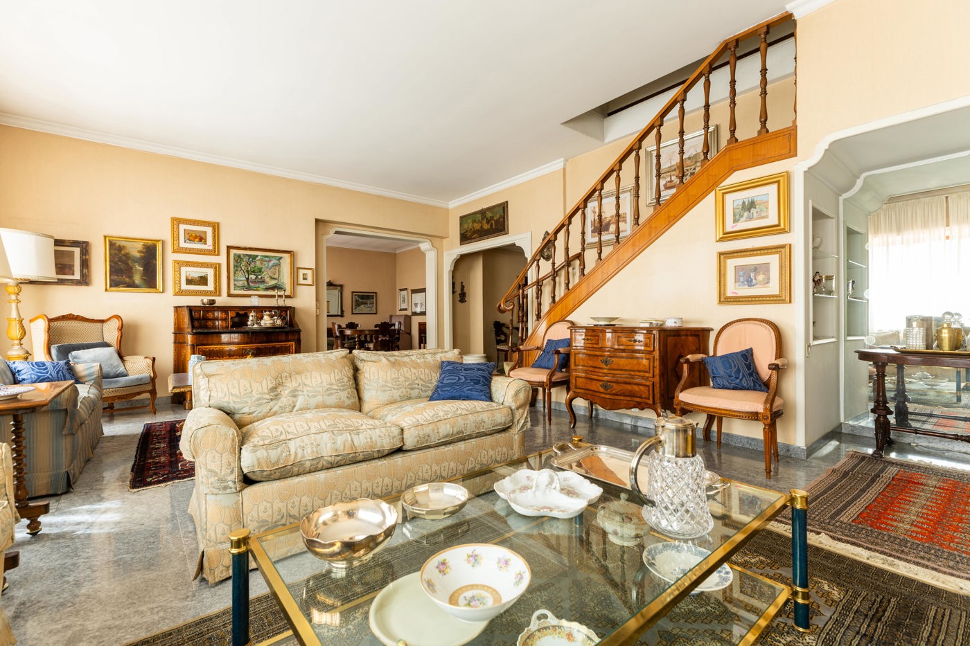 Al piano attico, un ingresso conduce a un salone doppio, affiancato da una sala da pranzo e da un tinello con servizio.