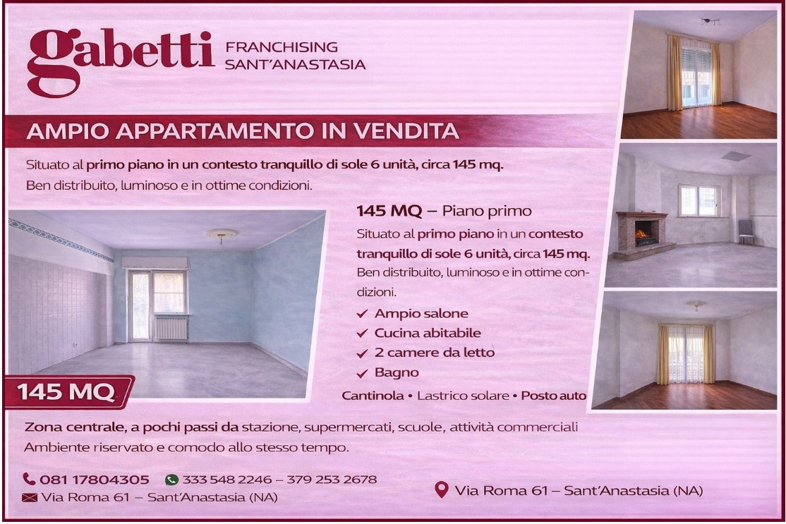 Per maggiori informazioni o per fissare un appuntamento: Gabetti Franchising SantAnastasia Via Roma 61 SantAnastasia (NA) Telefono fisso: 081 17804305 WhatsApp / Cellulare: 333 548 2246 379 253 2678 Email: *******@******* Contatta l'inserzionista