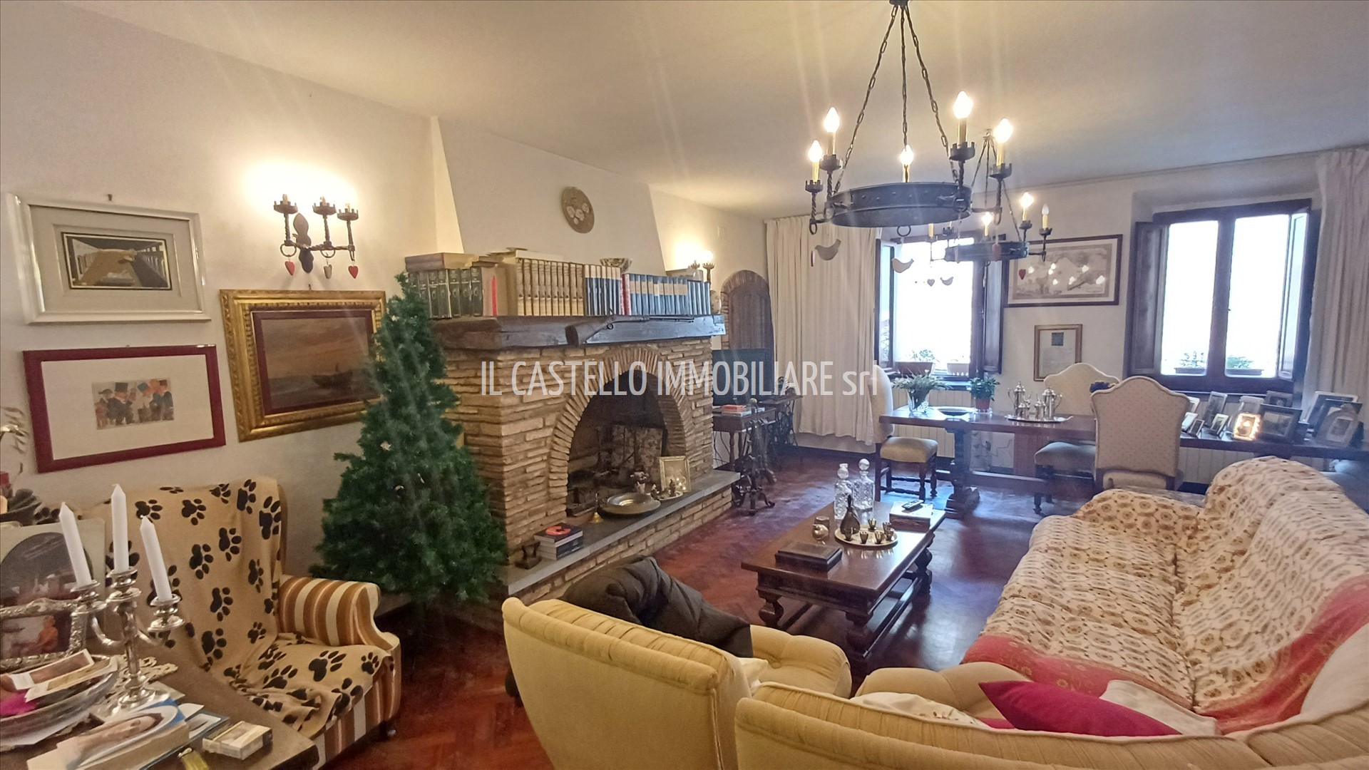 La superficie complessiva misura circa mq 260. L'appartamento dispone di ingresso, grande salone con caminetto, cucina / pranzo, disimpegno, due camere da letto, salendo pochi gradini dispone di un salone con soppalco bagno, ripostiglio, studio, ripostiglio, cameretta con finestra sulla piazza centrale, così come la altra grande camera adiacente.