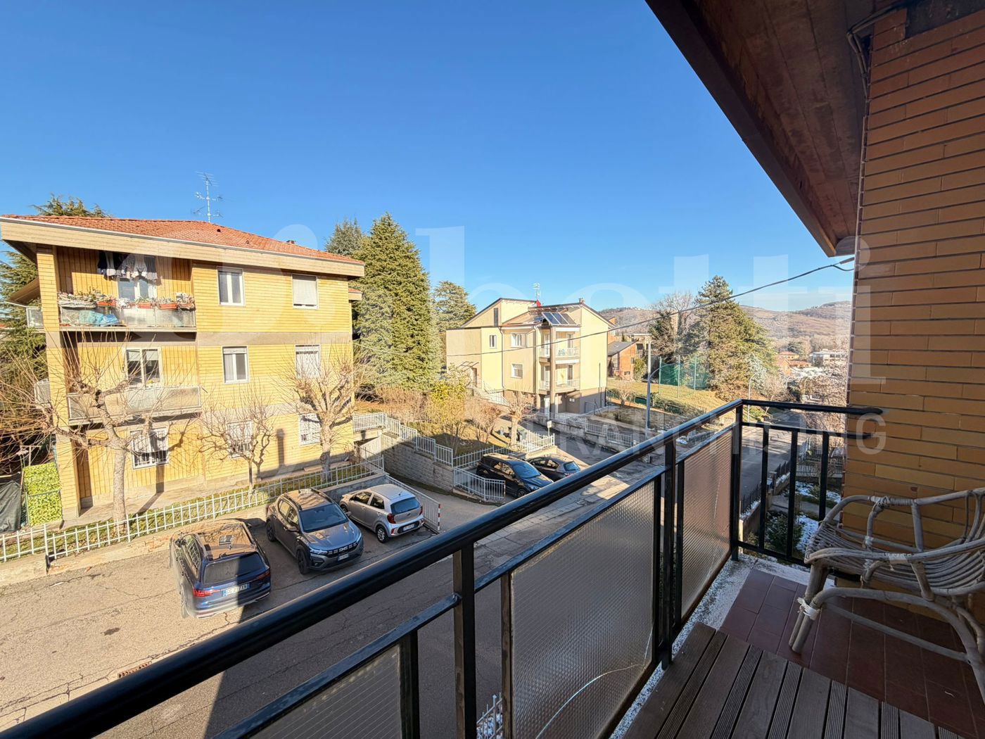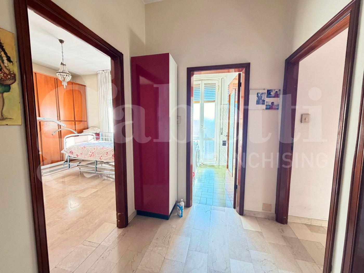 L'alloggio composto da ampio ingresso, soggiorno con camino ed accesso ad un primo balcone, cucina abitabile con dispensa e secondo balcone.