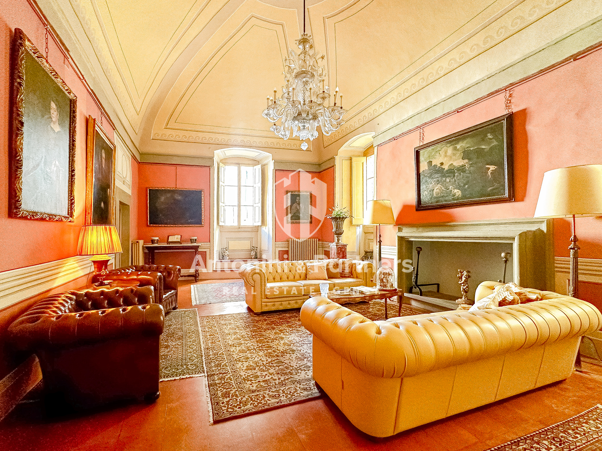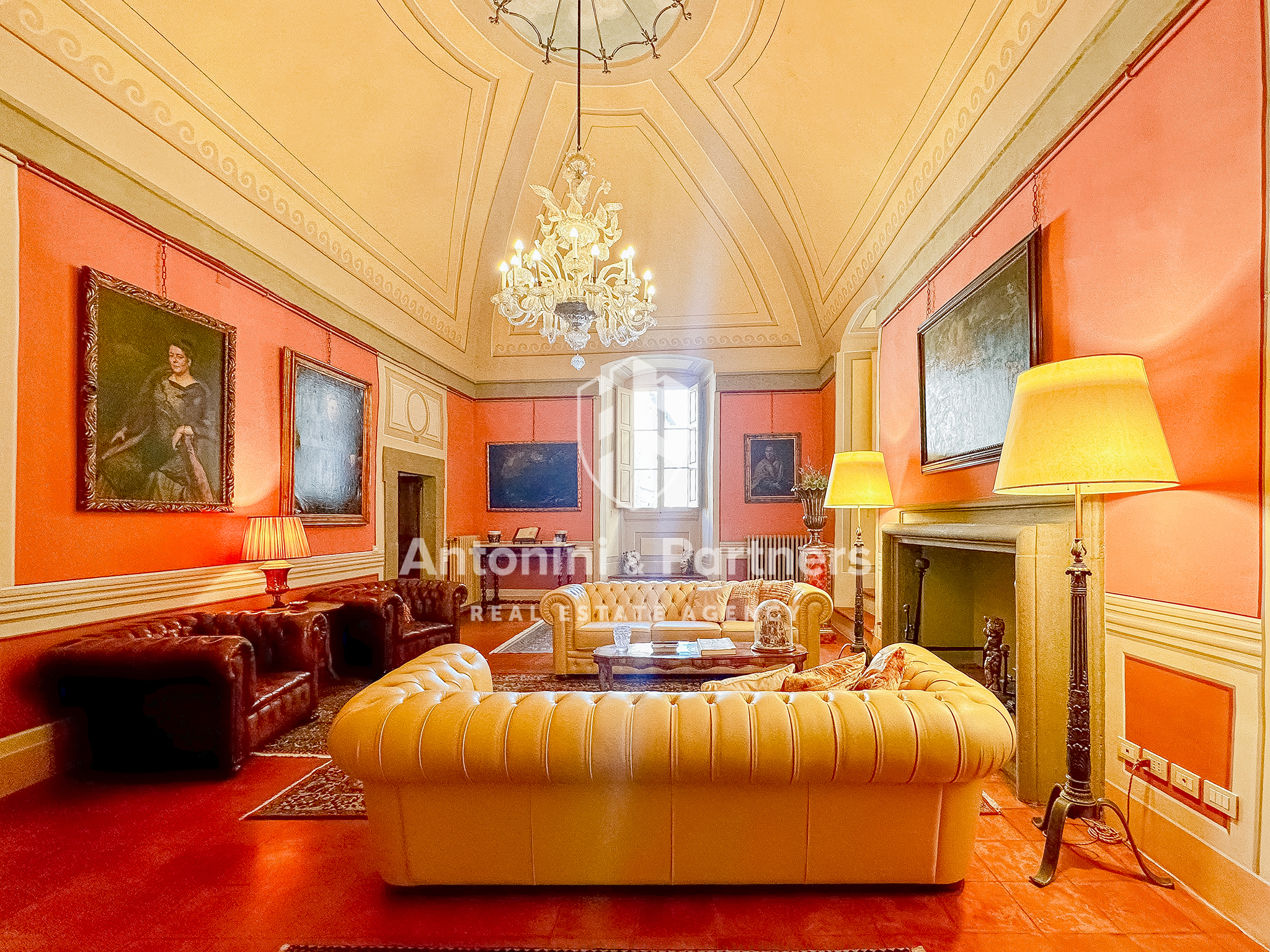 E si divide tra: - L'ampia zona giorno composta da: ingresso, cucina abitabile, sala da pranzo affrescata con camino, salone di rappresentanza anch'esso affrescato e con camino, studio, sala relax con tv e bagno.