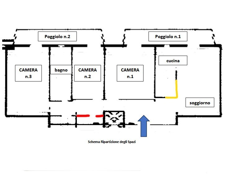 L'IMMOBILE E' COMPOSTO DA: INGRESSO, CORRIDOIO CON DUE CONTIGUI RIPOSTIGLI, ATTRAVERSO IL QUALE SI ACCEDE ALLE TRE CAMERE DA LETTO E AL BAGNO.