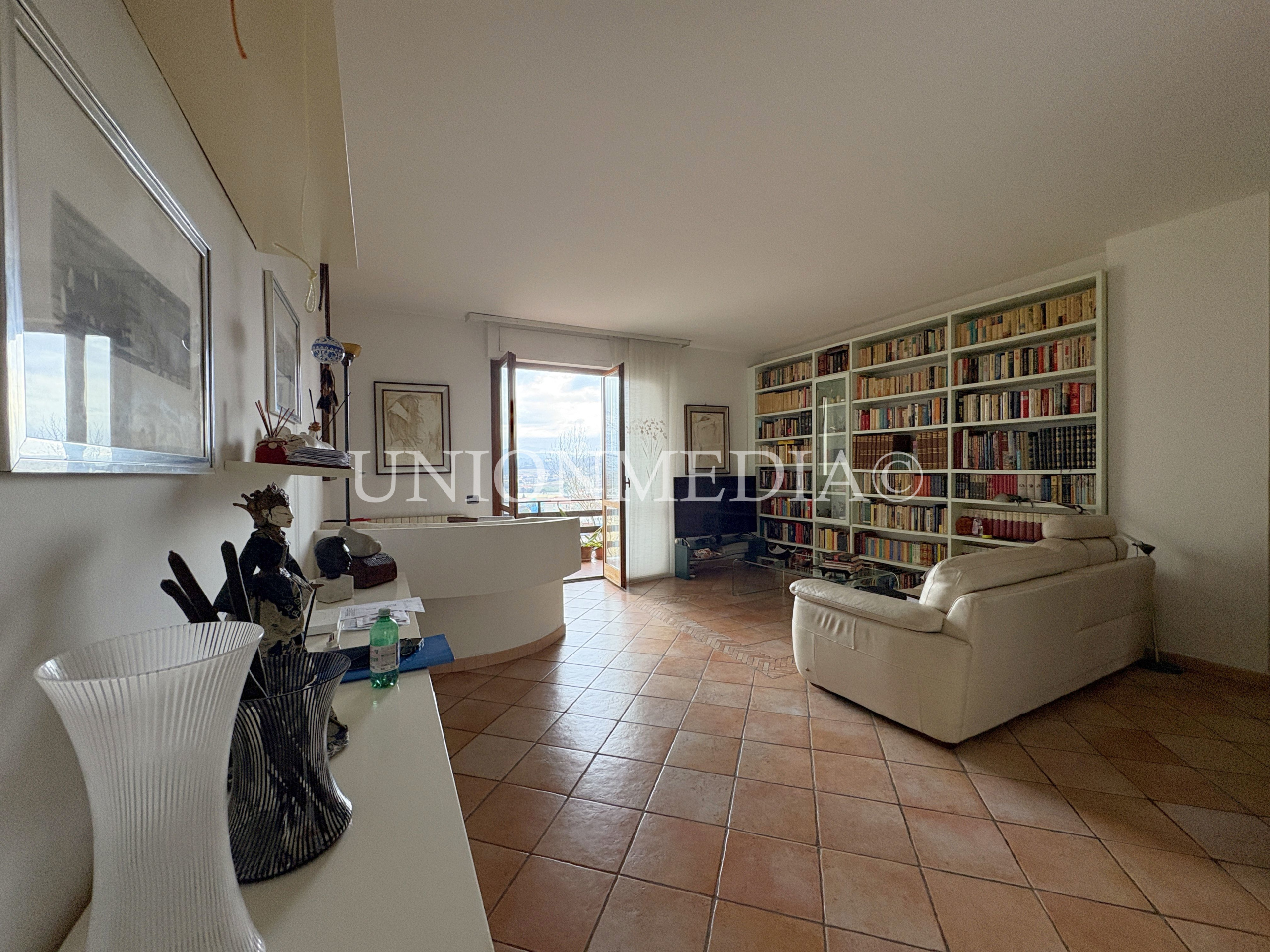 Una scala a chiocciola collega internamente lappartamento al piano inferiore, dove troviamo una spaziosa taverna con camino, perfetta come zona conviviale, oltre a un ripostiglio/cantina e a un secondo bagno.