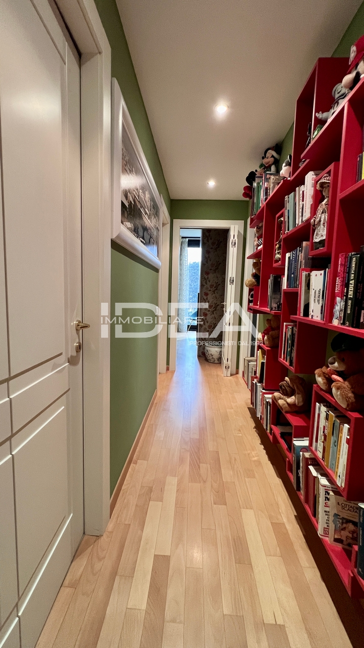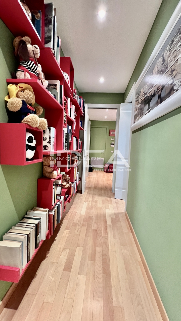 La pavimentazione interamente in parquet, ad eccezione della cucina e dei bagni.