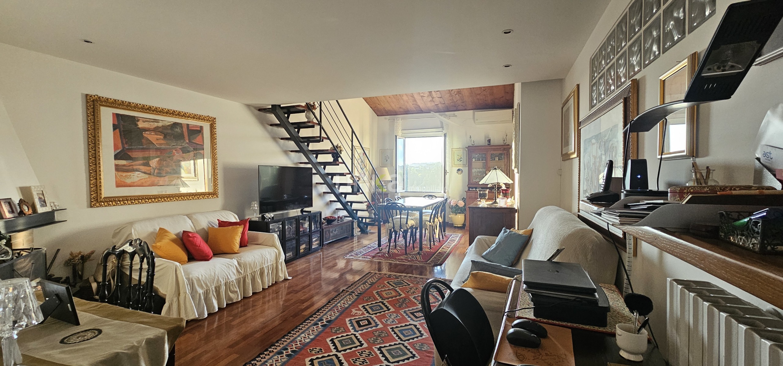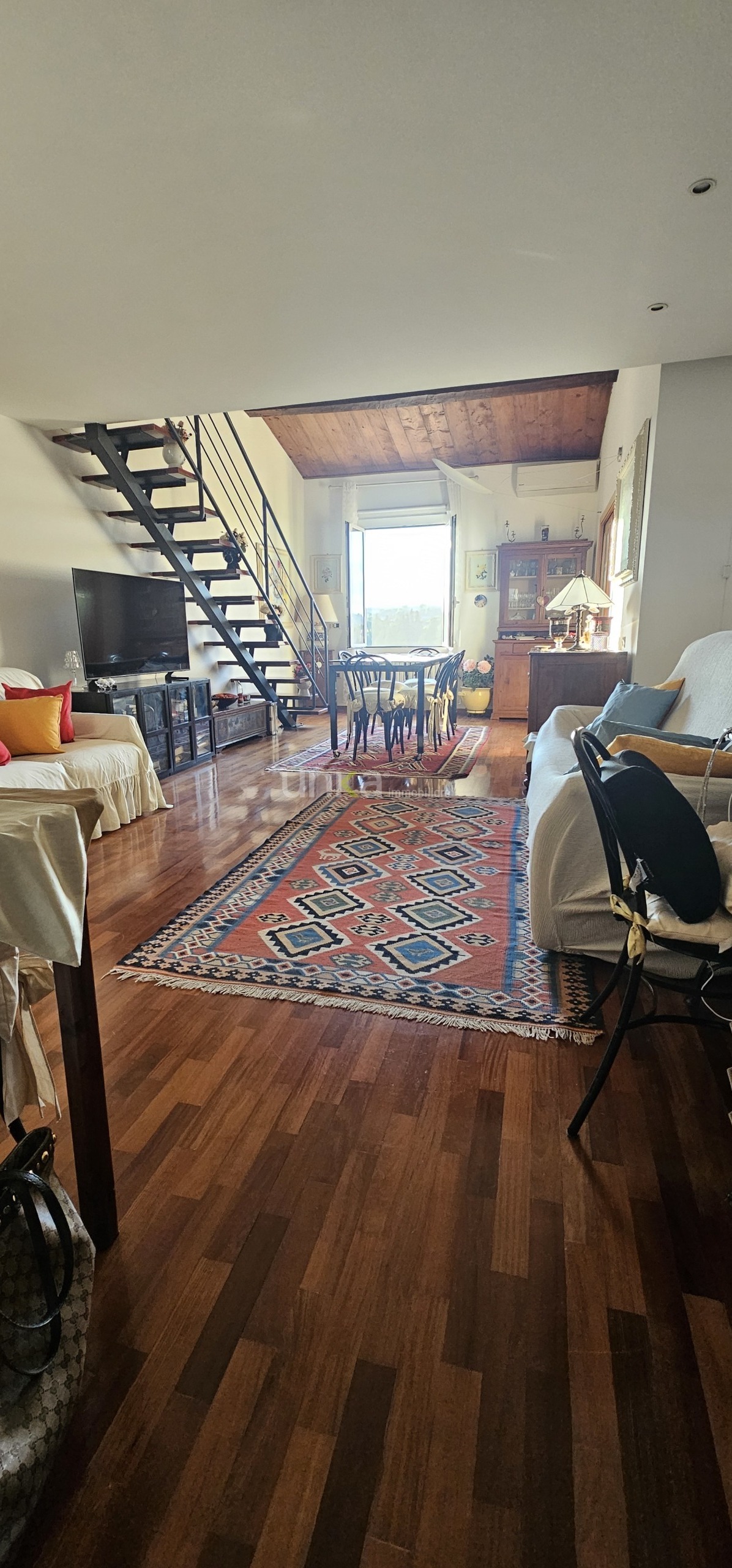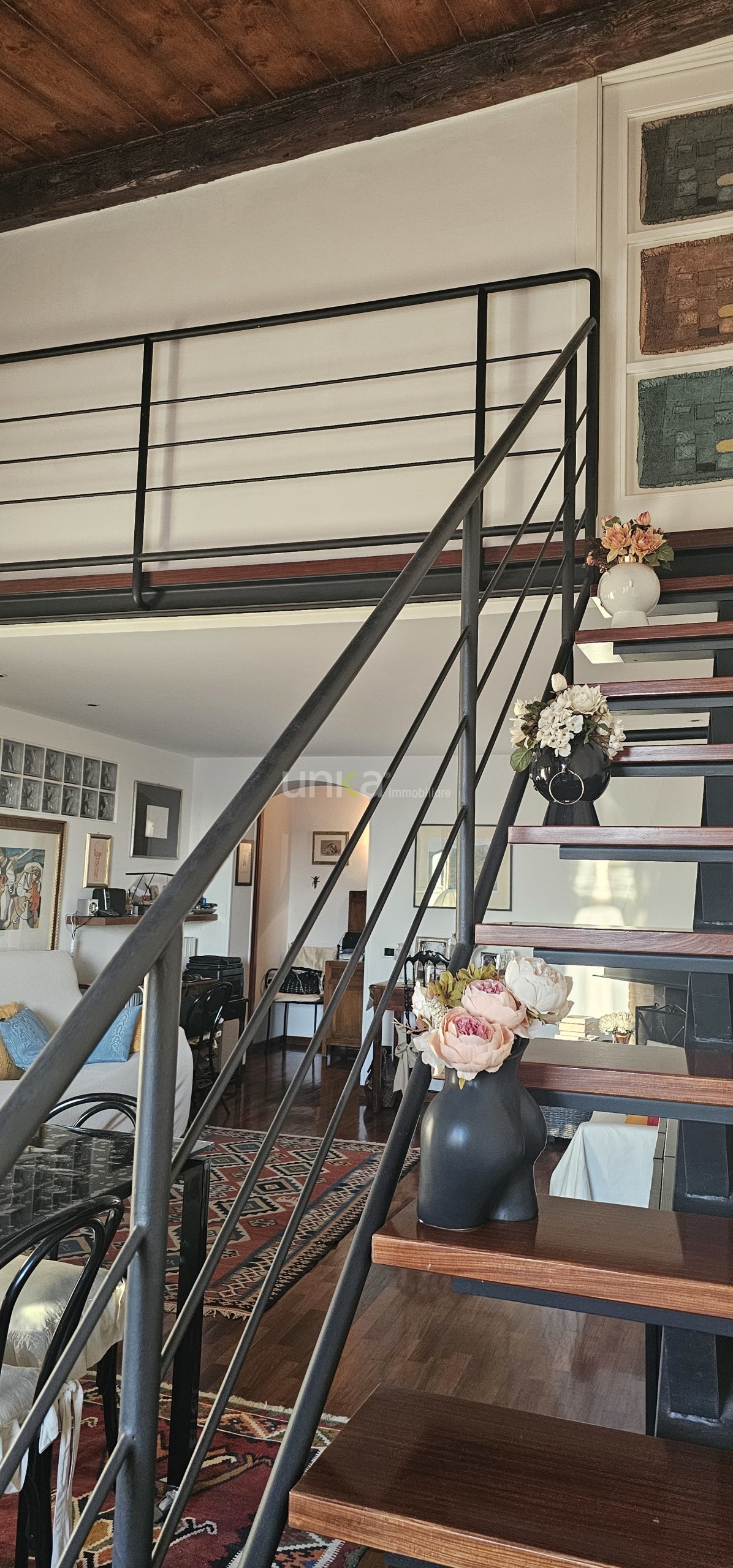Lateralmente al salone troviamo una scala d'arredo che ci da la possibilità di raggiungere un soppalco con camera/studio, reparto notte con due camere di qui una con cabina armadio, bagno e ripostiglio con altri armadi.